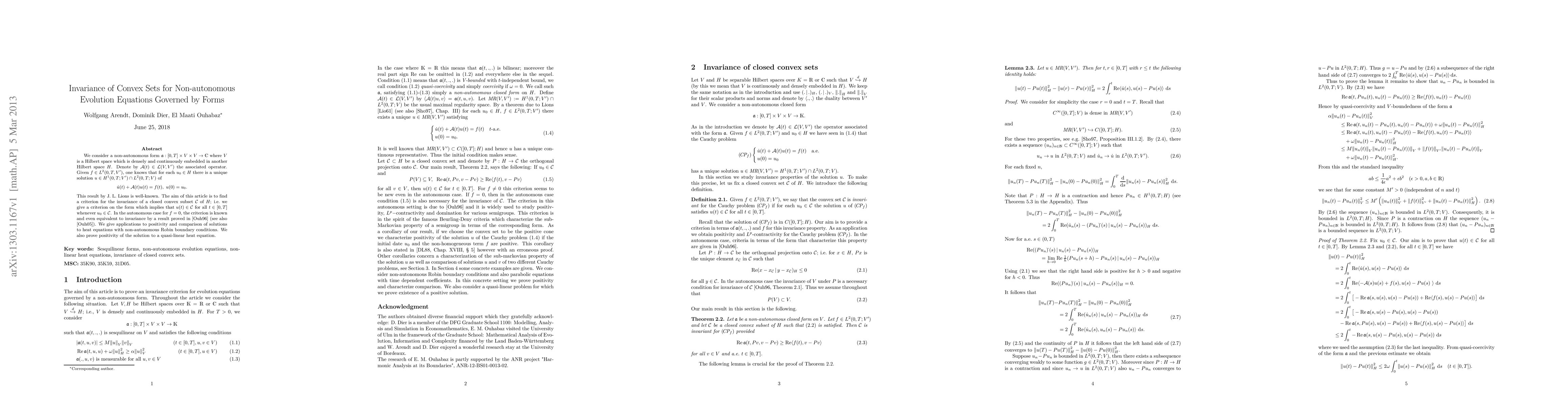 We consider a non-autonomous form $\fra:[0,T]\times V\times V \to \C$ where $V$ is a Hilbert space which is densely and continuously embedded in another Hilbert space $H$. Denote by $\A(t) \in \L(V,V')$ the associated operator. Given $f \in L^2(0,T, V')$, one knows that for each $u_0 \in H$ there is a unique solution $u\in H^1(0,T;V')\cap L^2(0,T;V)$ of $$\dot u(t) + \A(t) u(t) = f(t), \, \, u(0) = u_0.$$ %\begin{align*} %&\dot u(t) + \A(t)u(t)= f(t)\ %& u(0)=u_0. %\end{align*} This result by J. L. Lions is well-known. The aim of this article is to find a criterion for the invariance of a closed convex subset $\Conv$ of $H$; i.e.\ we give a criterion on the form which implies that $u(t)\in \Conv$ for all $t\in[0,T]$ whenever $u_0\in\Conv$. In the autonomous case for $f = 0$, the criterion is known and even equivalent to invariance by a result proved in \cite{Ouh96} (see also \cite{Ouh05}). We give applications to positivity and comparison of solutions to heat equations with non-autonomous Robin boundary conditions. We also prove positivity of the solution to a quasi-linear heat equation.