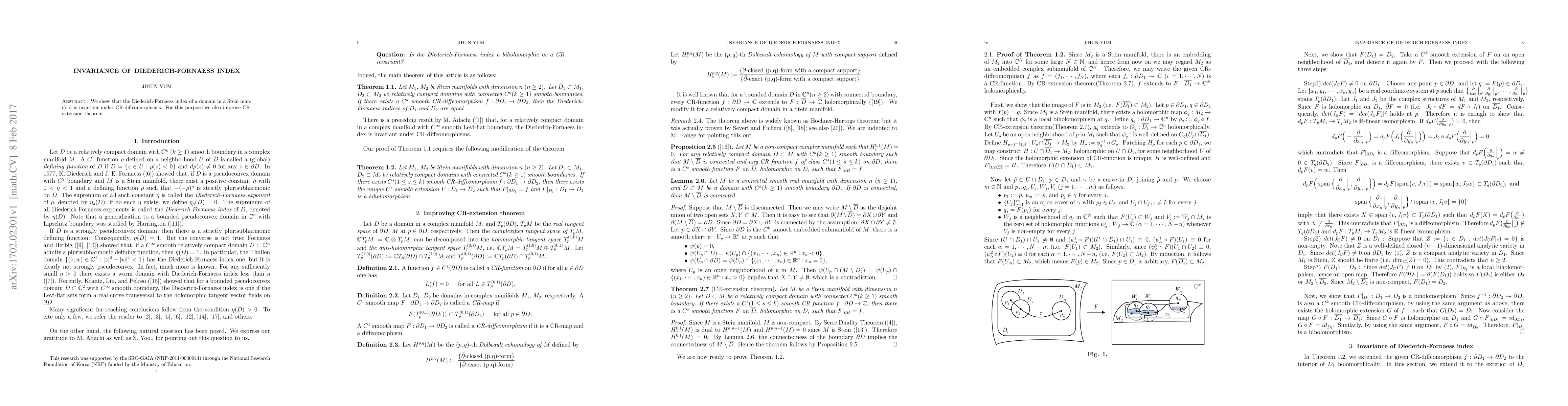 Summary: This paper demonstrates the invariance of the Diederich-Fornaess index under CR-diffeomorphisms in Stein manifolds, and enhances the CR-extension theorem in the process.