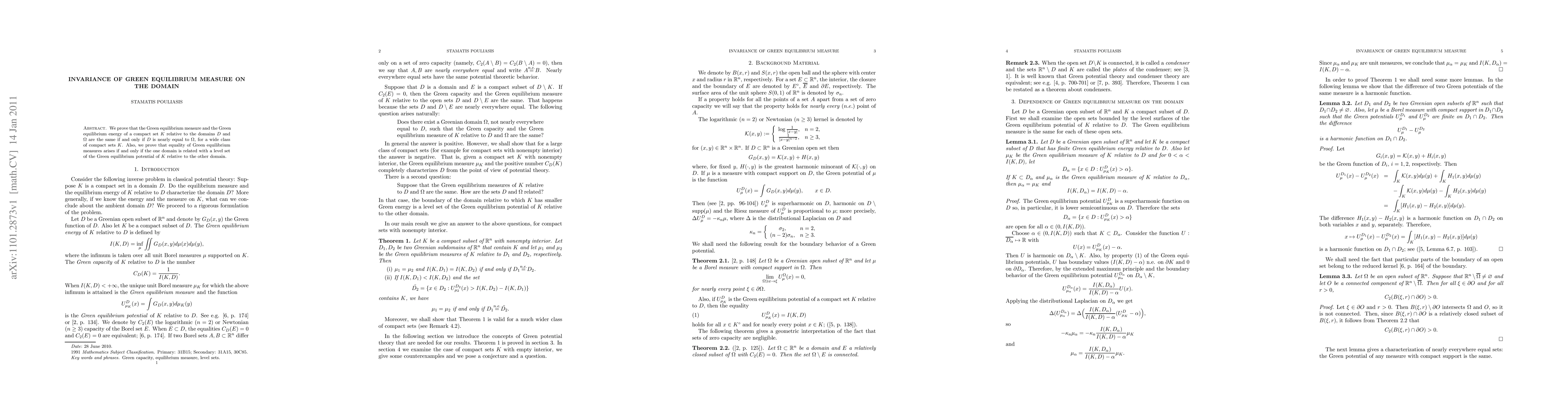 The Green equilibrium measure for a compact set K is invariant to nearly equal domains D and G, and equality occurs if one domain is related to the level set of the other's potential.