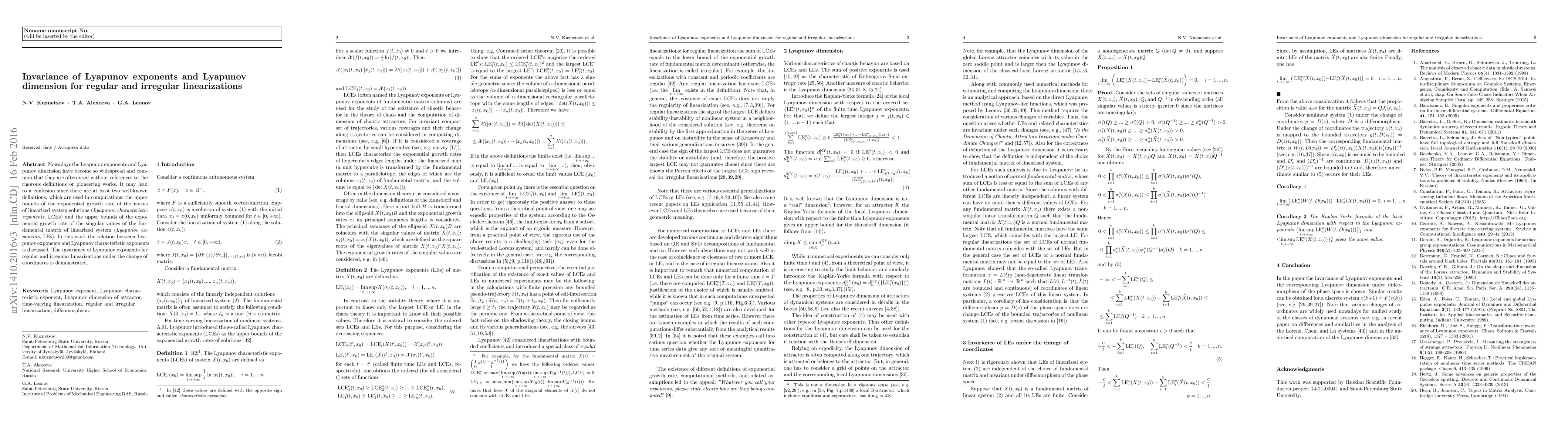 Nowadays the Lyapunov exponents and Lyapunov dimension have become so widespread and common that they are often used without references to the rigorous definitions or pioneering works. It may lead to a confusion since there are at least two well-known definitions, which are used in computations: the upper bounds of the exponential growth rate of the norms of linearized system solutions (Lyapunov characteristic exponents, LCEs) and the upper bounds of the exponential growth rate of the singular values of the fundamental matrix of linearized system (Lyapunov exponents, LEs). In this work the relation between Lyapunov exponents and Lyapunov characteristic exponents is discussed. The invariance of Lyapunov exponents for regular and irregular linearizations under the change of coordinates is demonstrated.