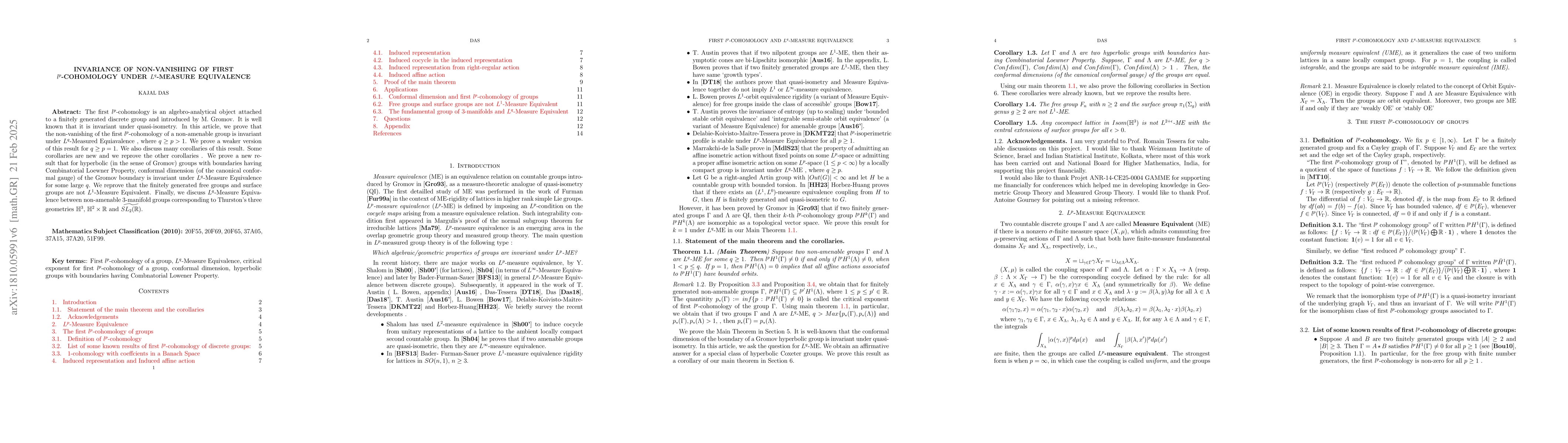 The first $l^p$-cohomology is an algebro-analytical object attached to a finitely generated discrete group and introduced by M. Gromov. It is well known that it is invariant under quasi-isometry. In this article, we prove that the non-vanishing of the first $l^p$-cohomology of a non-amenable group is invariant under $L^q$-Measured Equiavalence (an equivalence relation introduced by Gromov), where $q\geq p$. We also discuss many applications of this result. We prove that for hyperbolic (in the sense of Gromov) Coxeter groups with boundaries having Combinatorial Loewner Property, conformal dimension (of the canonical conformal gauge) of the Gromov boundary is invariant under $L^q$-Measured Equivalence for some large $q$. We prove that the finitely generated free groups and surface groups are not $L^1$-Measured Equivalent. We also give a lower bound of the critical exponent for the first $l^p$-cohomology of any lattice in $SO(n,1)$. Finally, we discuss $L^q$-Measured Equivalence between non-amenable 3-manifold groups corresponding to Thurston's three geometries $\mathbb{H}^3$, $\mathbb{H}^2\times\mathbb{R}$ and $\widetilde{SL_2(\mathbb{R})}$.