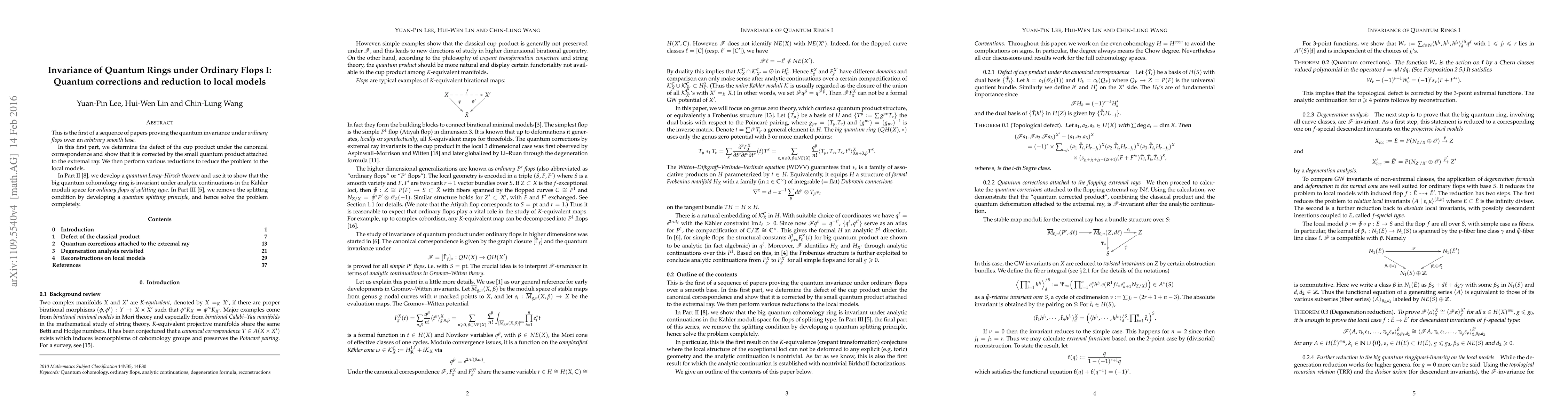 This paper proves quantum invariance under ordinary flops, determining the defect in the cup product and correcting it via the small quantum product. It also reduces the problem to local models, setting the stage for subsequent parts that further develop quantum theory for such transformations.