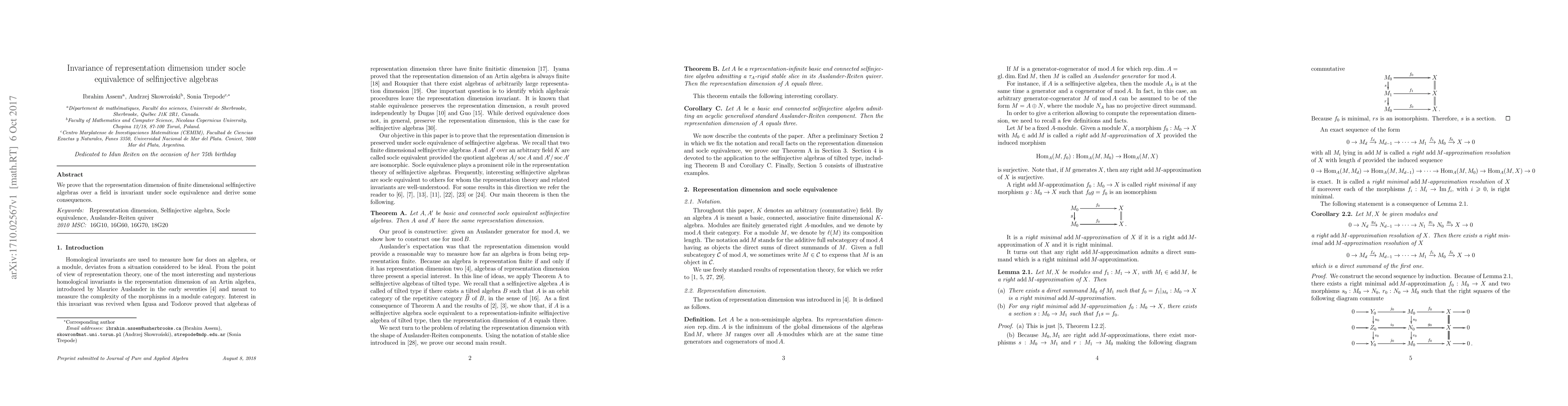 Summary: This paper proves that the representation dimension of finite-dimensional selfinjective algebras remains unchanged under socle equivalence and explores its implications. The findings highlight a key invariant property in the study of selfinjective algebras.