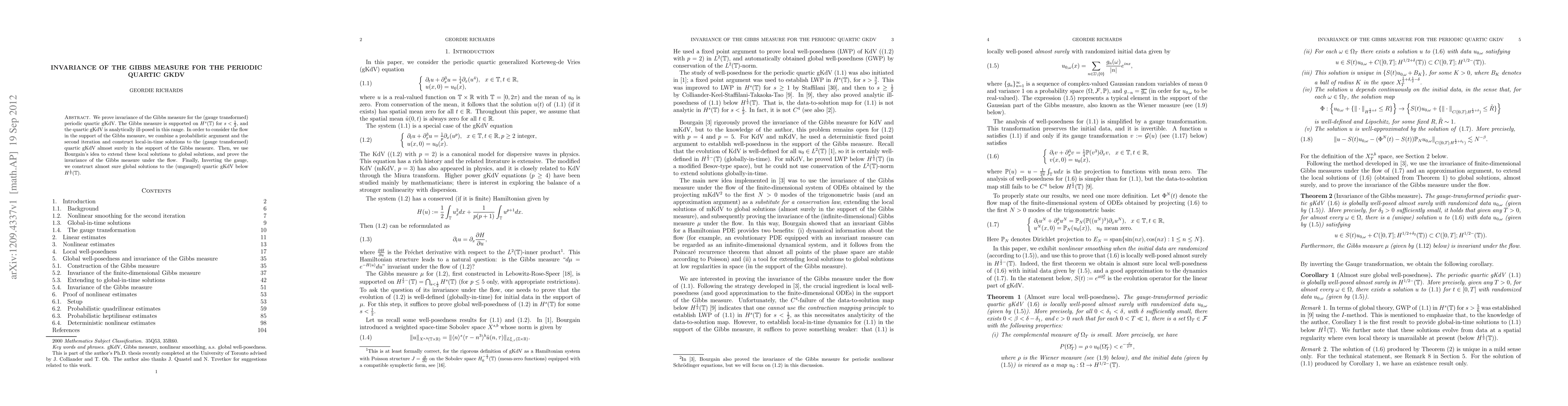 We prove invariance of the Gibbs measure for the (gauge transformed) periodic quartic gKdV. The Gibbs measure is supported on H^s for s<1/2, and the quartic gKdV is analytically ill-posed in this range. In order to consider the flow in the support of the Gibbs measure, we combine a probabilistic argument and the second iteration and construct local-in-time solutions to the (gauge transformed) quartic gKdV almost surely in the support of the Gibbs measure. Then, we use Bourgain's idea to extend these local solutions to global solutions, and prove the invariance of the Gibbs measure under the flow. Finally, Inverting the gauge, we construct almost sure global solutions to the (ungauged) quartic gKdV below H^{1/2}.