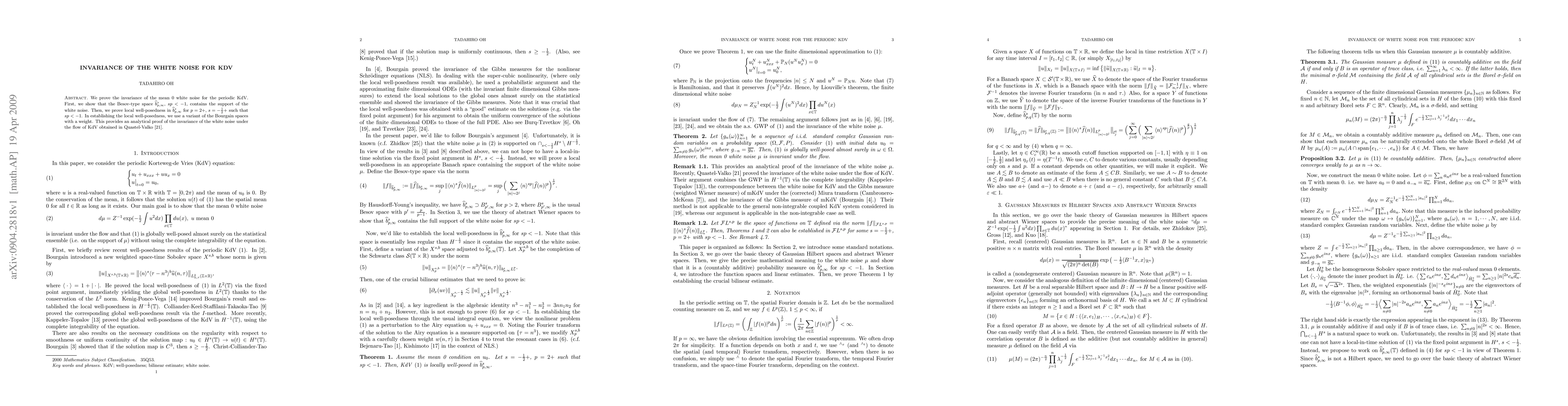 This research proves the analytical invariance of mean-zero white noise under the Korteweg-de Vries (KdV) equation flow. It demonstrates that white noise's support is within Besov-type space hat{b}^s_{p, infty}, sp <-1, and establishes local well-posedness in this space for specific p and s values using weighted Bourgain spaces. This supports Quastel-Valko's earlier finding on white noise invariance under KdV.