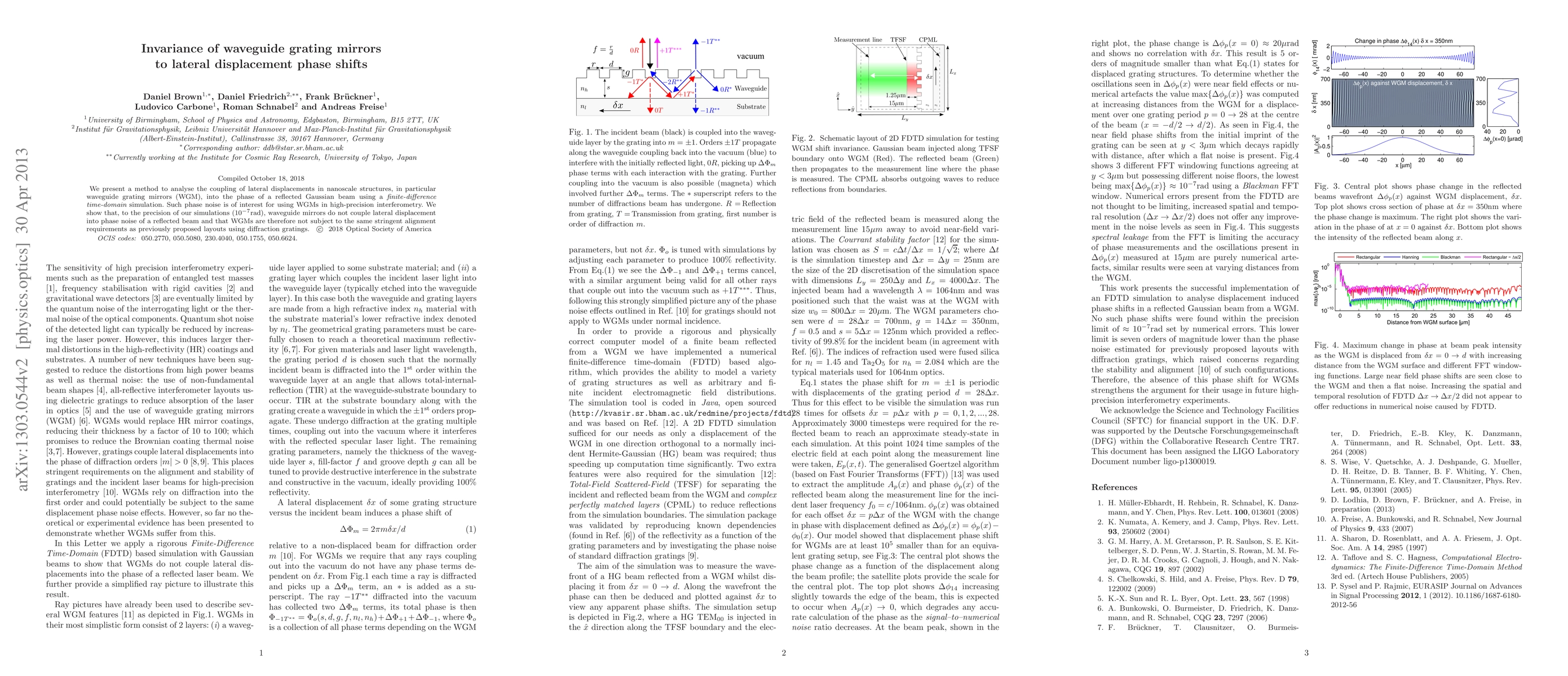 We present a method to analyse the coupling of lateral displacements in nanoscale structures, in particular waveguide grating mirrors (WGM), into the phase of a reflected Gaussian beam using a finite-difference time-domain simulation. Such phase noise is of interest for using WGMs in high-precision interferometry. We show that WGMs do not couple lateral displacements into the phase of a reflected beam to a precision of 10^{-7} rad and that WGMs are therefore not subject to the same stringent alignment requirements as previously proposed layouts using diffraction gratings.