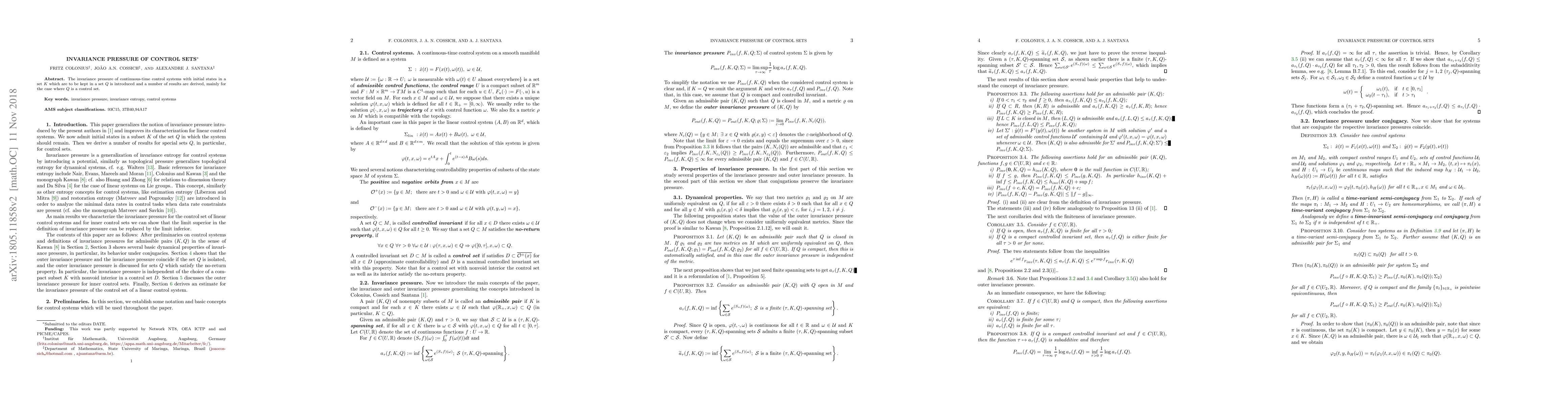 The invariance pressure of continuous-time control systems with initial states in a set K which are to be kept in a set Q is introduced and a number of results are derived, mainly for the case where Q is a control set.