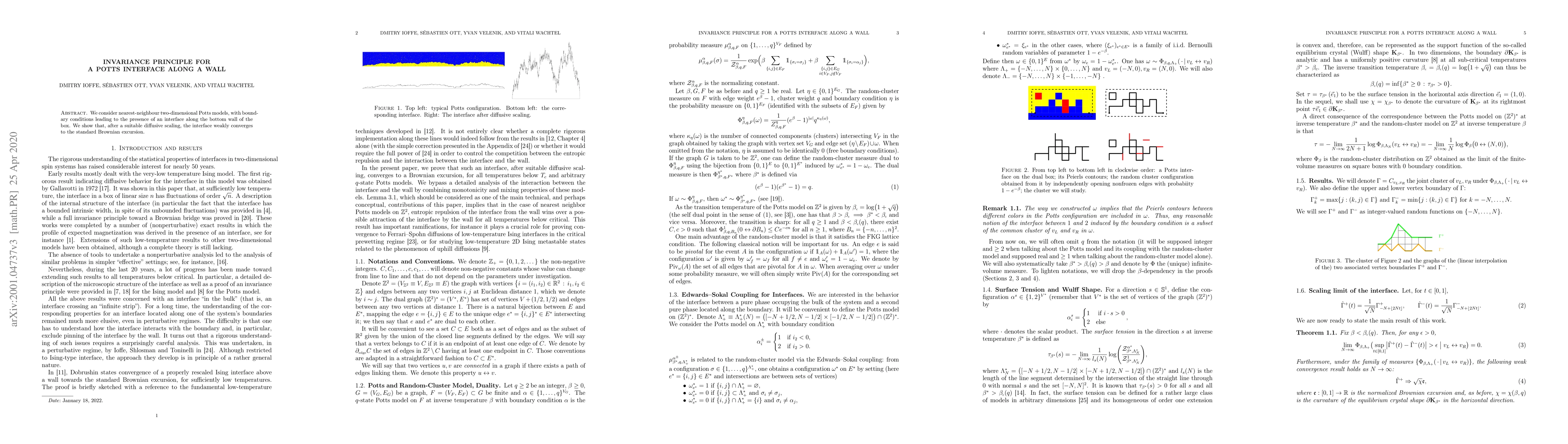 Summary: This study investigates the interface behavior in two-dimensional Potts models with boundary conditions, demonstrating that after diffusive scaling, the interface converges to a standard Brownian excursion, establishing an invariance principle.