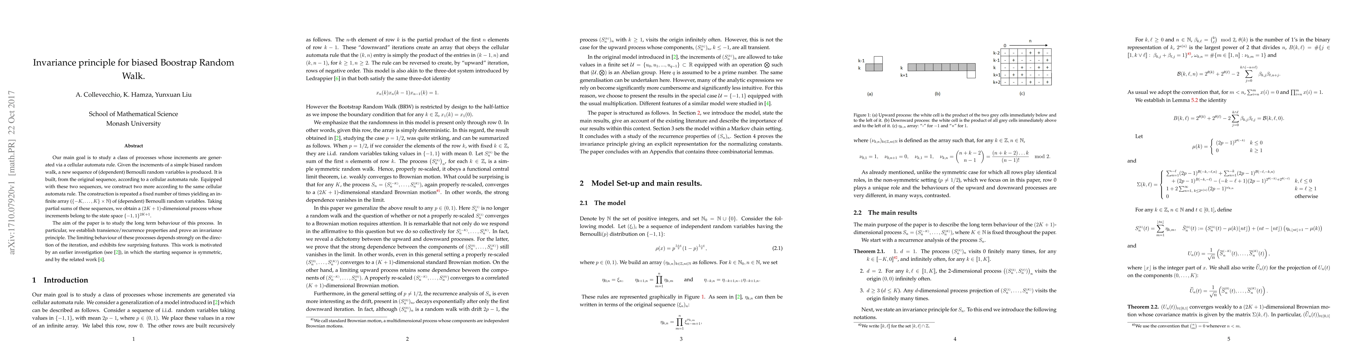 Our main goal is to study a class of processes whose increments are generated via a cellular automata rule. Given the increments of a simple biased random walk, a new sequence of (dependent) Bernoulli random variables is produced. It is built, from the original sequence, according to a cellular automata rule. Equipped with these two sequences, we construct two more according to the same cellular automata rule. The construction is repeated a fixed number of times yielding an infinite array ($\{-K,\ldots,K\}\times\N$) of (dependent) Bernoulli random variables. %In turn, using this new sequence as input, we reiterate a construction of a new sequence. %This process is repeated a finite number of times resulting in an infinite array, herein called the "downward process", of highly dependent Bernoulli random variables. The process of taking partial products can be reversed allowing to construct new sequences, herein called the "upward process", the characteristics of which are different from the downward process. Taking partial sums of these sequences, we obtain a $(2K+1)$-dimensional process whose increments belong to the state space $\{-1,1\}^{2K+1}$. The aim of the paper is to study the long term behaviour of this process. In particular, we establish transience/recurrence properties and prove an invariance principle. The limiting behaviour of these processes depends strongly on the direction of the iteration, and exhibits few surprising features. This work is motivated by an earlier investigation in which the starting sequence is symmetric.