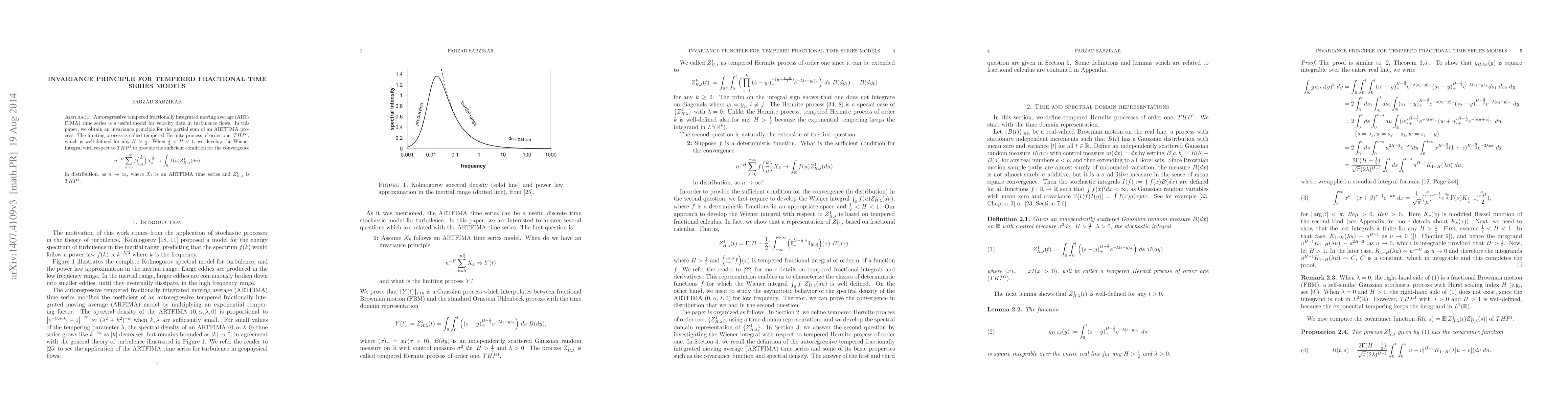 This paper establishes an invariance principle for the partial sum of an ARTFIMA time series model, showing convergence to a tempered Hermite process of order one, $THP^{1}$, for $H>\frac{1}{2}$. It also develops a Wiener integral with respect to $THP^{1}$ to provide conditions for the convergence of a scaled sum of the series.