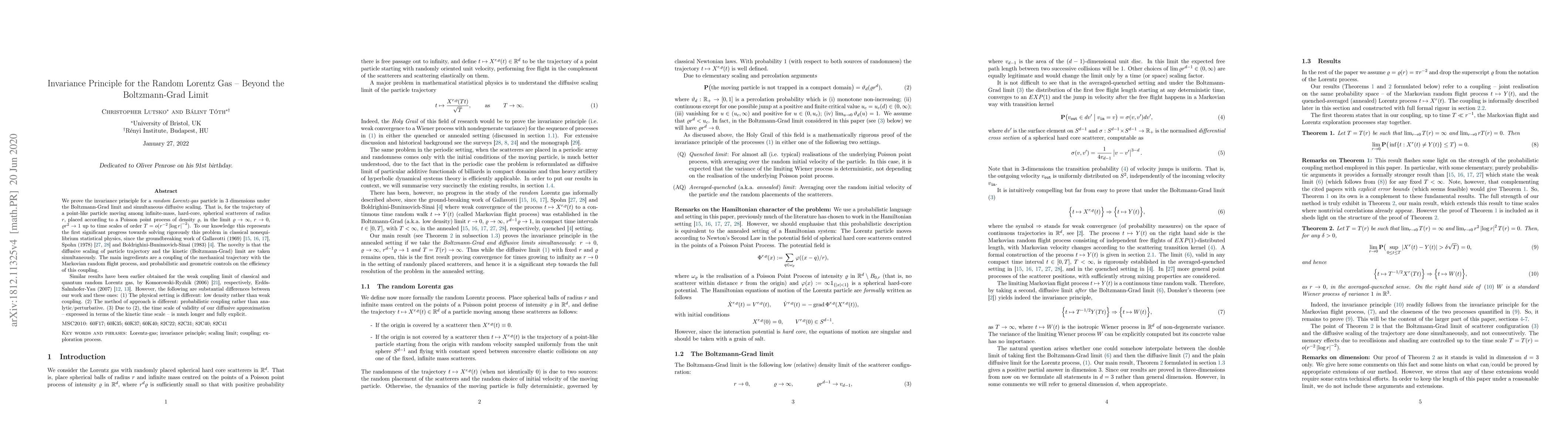 This paper proves the invariance principle for a 3D random Lorentz gas under the Boltzmann-Grad limit and diffusive scaling, marking a significant advancement in classical nonequilibrium statistical physics. The study employs probabilistic coupling and geometric controls to achieve a longer and explicit diffusive approximation time scale compared to previous works.