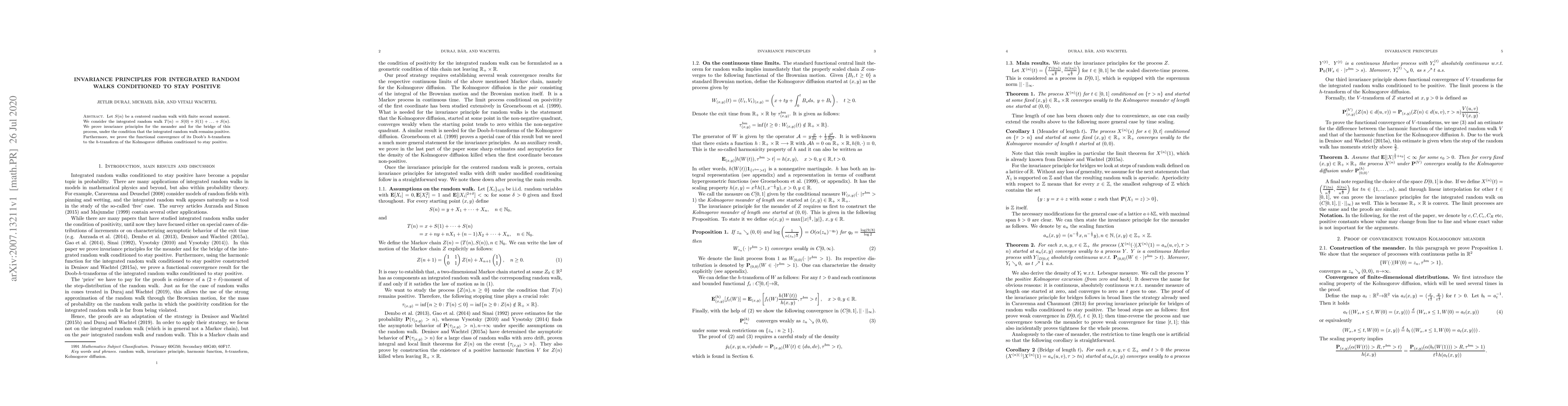 This paper proves invariance principles for the meander and bridge of an integrated random walk conditioned to stay positive, and establishes functional convergence of its Doob's $h$-transform to the $h$-transform of the Kolmogorov diffusion under the same condition.