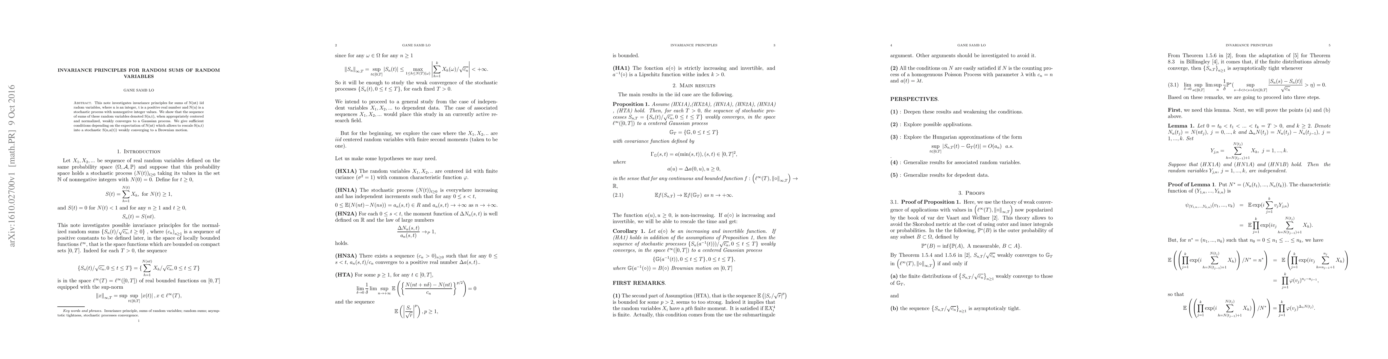 This paper explores invariance principles for random sums of independent and identically distributed (iid) random variables, where the number of terms is governed by a stochastic process. It demonstrates that these sums converge to a Gaussian process under proper centering and normalization, and provides conditions for rescaling them to converge to a Brownian motion.