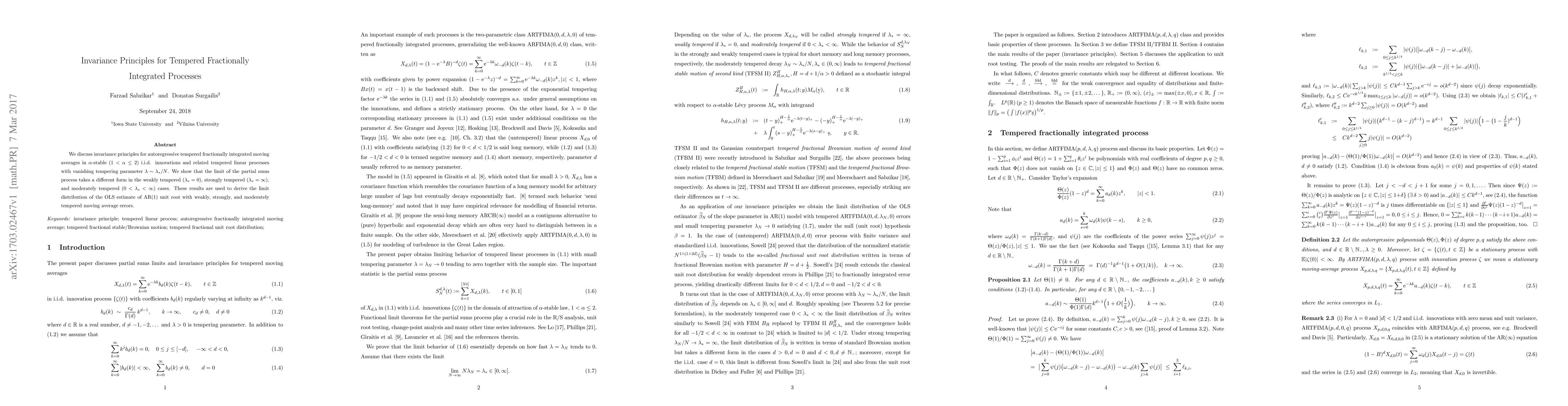 This paper explores invariance principles for autoregressive tempered fractionally integrated processes driven by $\alpha$-stable innovations, revealing distinct limit forms for weakly, strongly, and moderately tempered cases. It derives the limit distribution of the OLS estimate for AR(1) unit root models with tempered moving average errors.