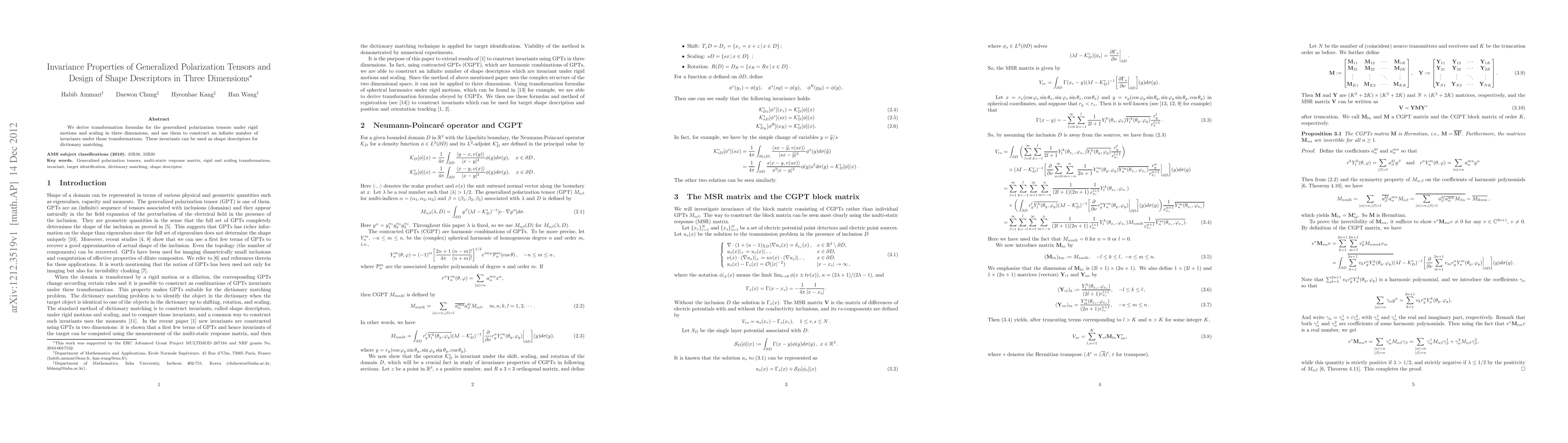 This paper derives transformation formulas for generalized polarization tensors under rigid motions and scaling, and constructs invariants that can serve as shape descriptors for three-dimensional objects, facilitating dictionary matching.