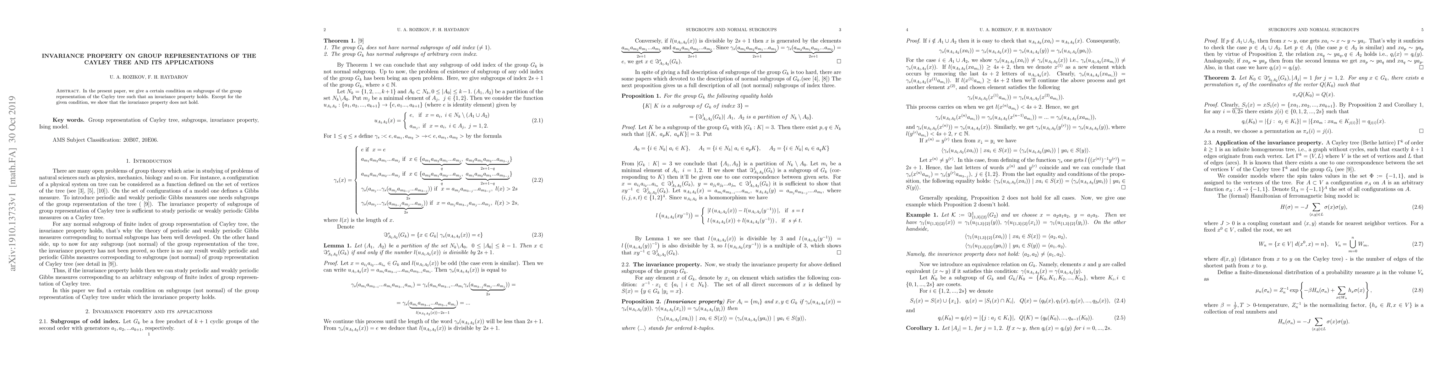 In the present paper, we give a certain condition on subgroups of the group representation of the Cayley tree such that an invariance property holds. Except for the given condition, we show that the invariance property does not hold.