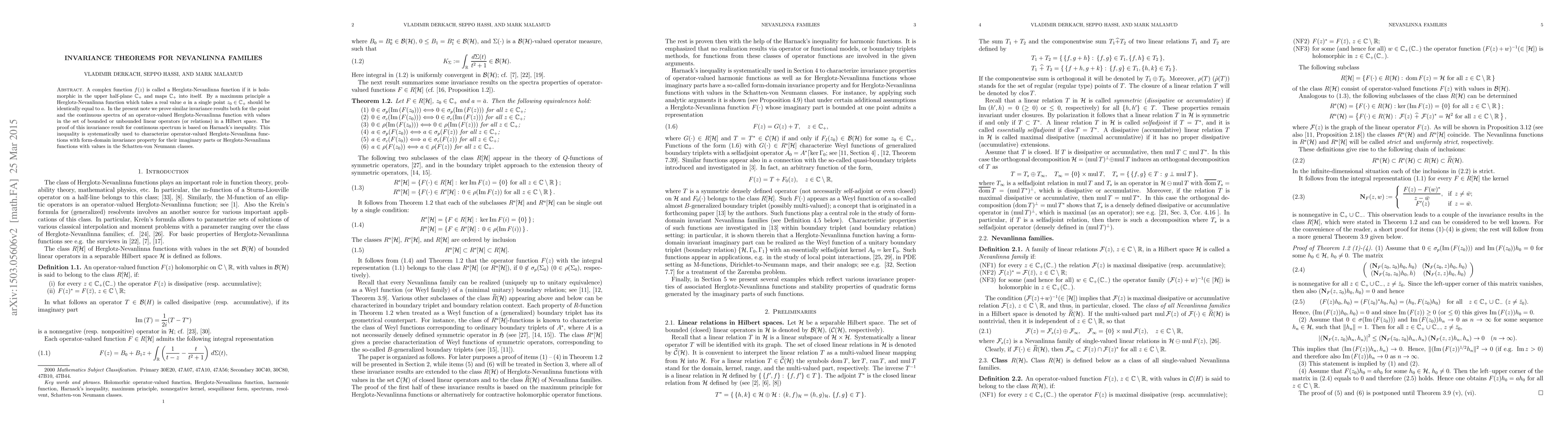 This paper proves invariance theorems for operator-valued Herglotz-Nevanlinna functions, showing that such functions maintain their form-domain invariance properties. The proof leverages Harnack's inequality to characterize these functions and their continuous spectra.