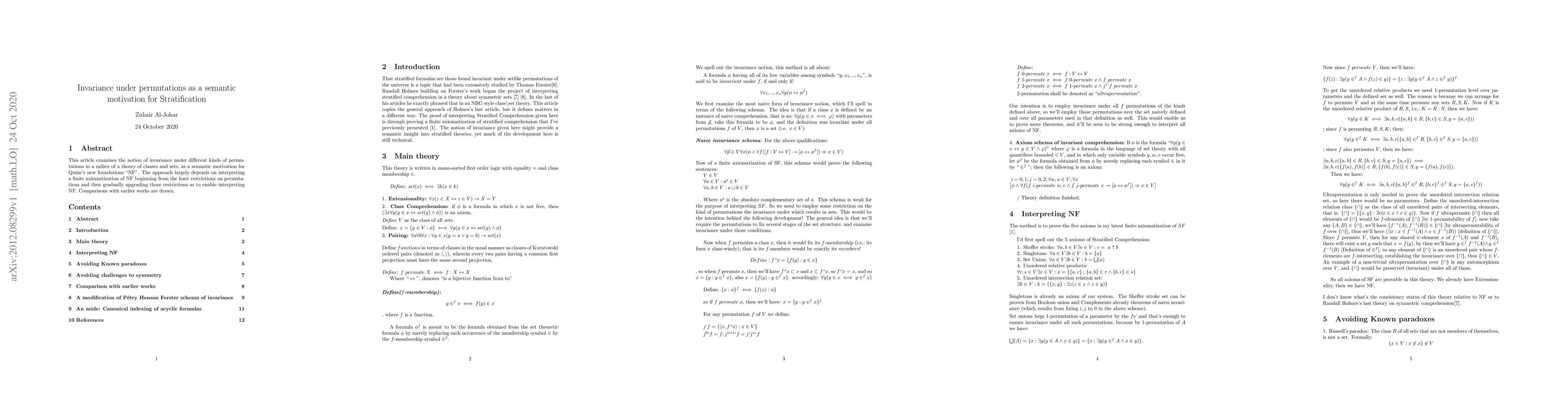 This article examines the notion of invariance under different kinds of permutations in a milieu of a theory of classes and sets, as a semantic motivation for Quine's new foundations "NF". The approach largely depends on interpreting a finite axiomatization of NF beginning from the least restrictions on permutations and then gradually upgrading those restrictions as to enable interpreting NF. Comparisons with earlier works are drawn.