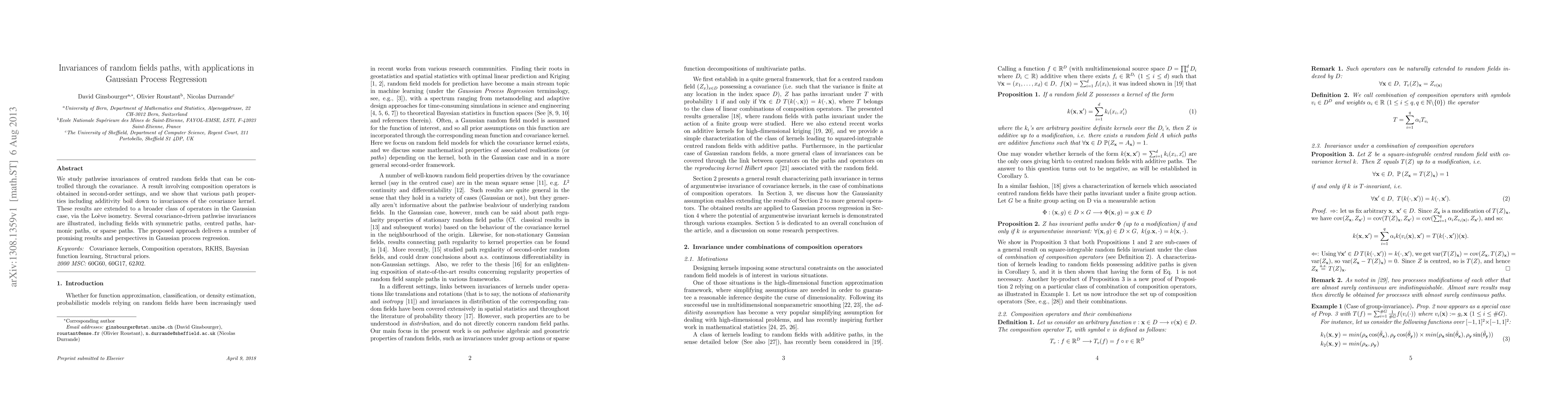 We study pathwise invariances of centred random fields that can be controlled through the covariance. A result involving composition operators is obtained in second-order settings, and we show that various path properties including additivity boil down to invariances of the covariance kernel. These results are extended to a broader class of operators in the Gaussian case, via the Lo\`eve isometry. Several covariance-driven pathwise invariances are illustrated, including fields with symmetric paths, centred paths, harmonic paths, or sparse paths. The proposed approach delivers a number of promising results and perspectives in Gaussian process regression.