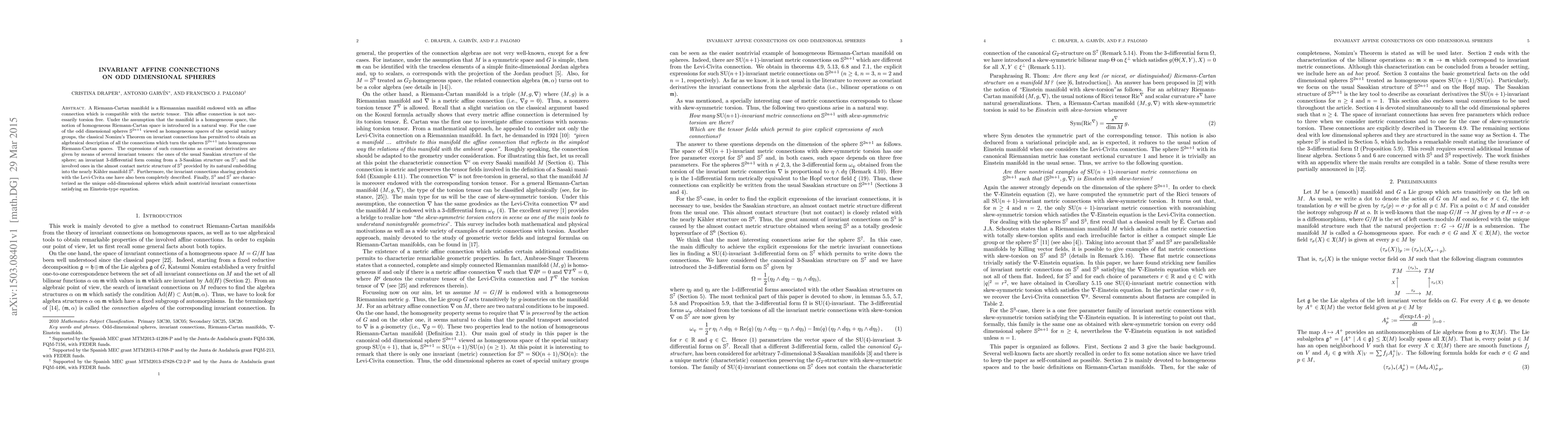 This paper explores invariant affine connections on odd-dimensional spheres, deriving algebraic descriptions for connections that transform these spheres into homogeneous Riemann-Cartan spaces using invariant tensors. It characterizes $\mathbb{S}^3$ and $\mathbb{S}^7$ as the only odd-dimensional spheres with nontrivial invariant connections that satisfy an Einstein-type equation.
