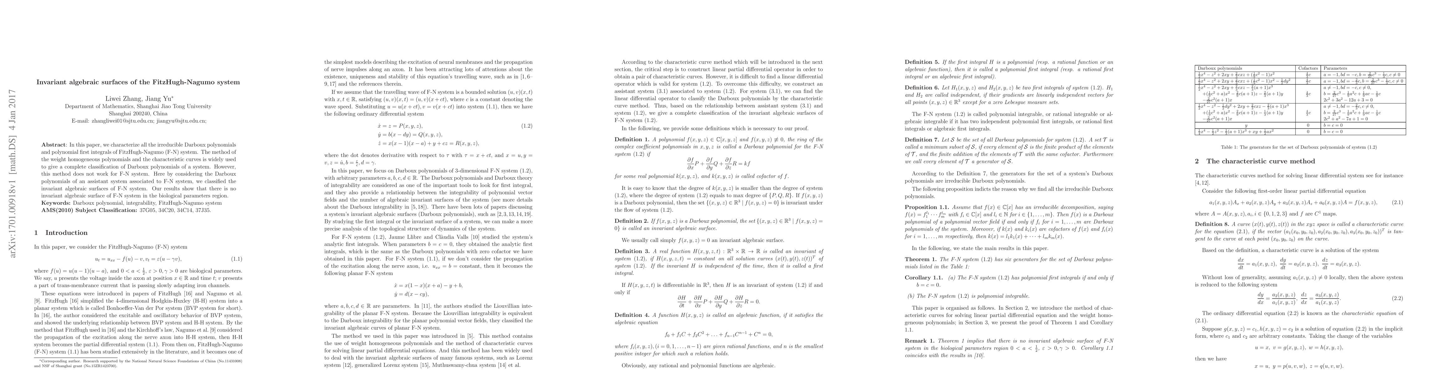 This research contributes to the understanding of the FitzHugh-Nagumo system's integrability and invariant surfaces, which is crucial for modeling nerve membrane behavior and other related physiological processes.