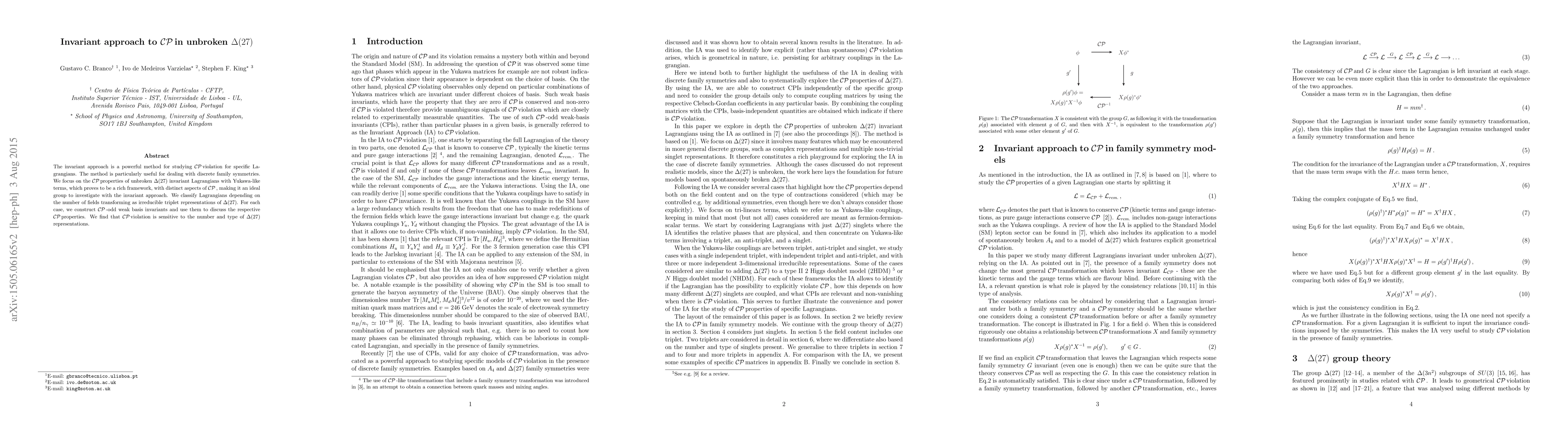 The invariant approach is a powerful method for studying CP violation for specific Lagrangians. The method is particularly useful for dealing with discrete family symmetries. We focus on the CP properties of unbroken $\Delta(27)$ invariant Lagrangians with Yukawa-like terms, which proves to be a rich framework, with distinct aspects of CP, making it an ideal group to investigate with the invariant approach. We classify Lagrangians depending on the number of fields transforming as irreducible triplet representations of $\Delta(27)$. For each case, we construct CP-odd weak basis invariants and use them to discuss the respective CP properties. We find that CP violation is sensitive to the number and type of $\Delta(27)$ representations.