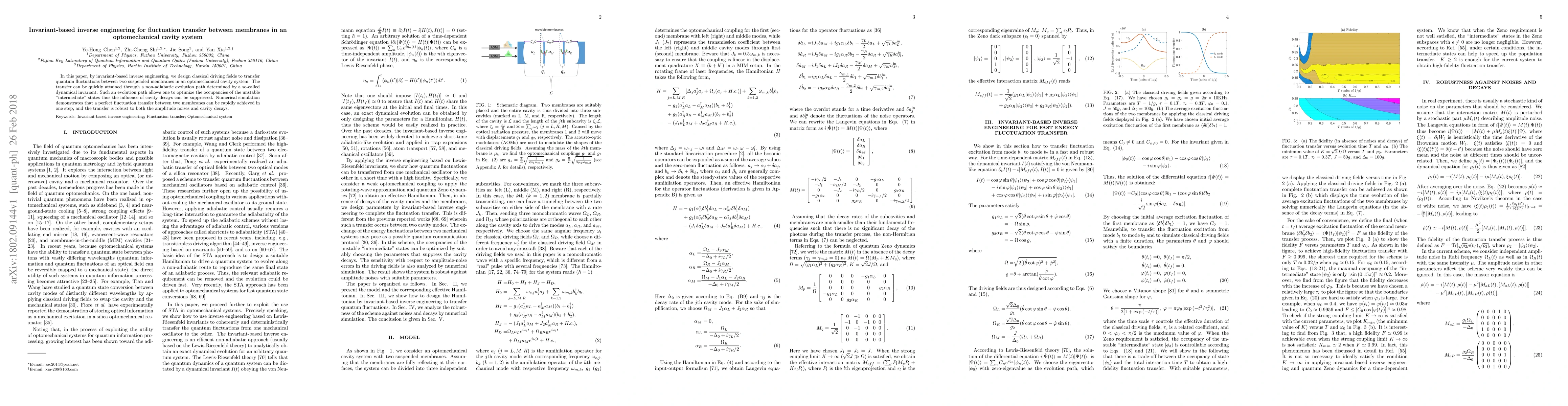 This paper proposes an invariant-based inverse engineering method to design classical driving fields for rapidly transferring quantum fluctuations between two suspended membranes in an optomechanical cavity system. The method utilizes a non-adiabatic evolution path determined by a dynamical invariant, optimizing intermediate states to suppress cavity decay effects, and demonstrates robust one-step fluctuation transfer.