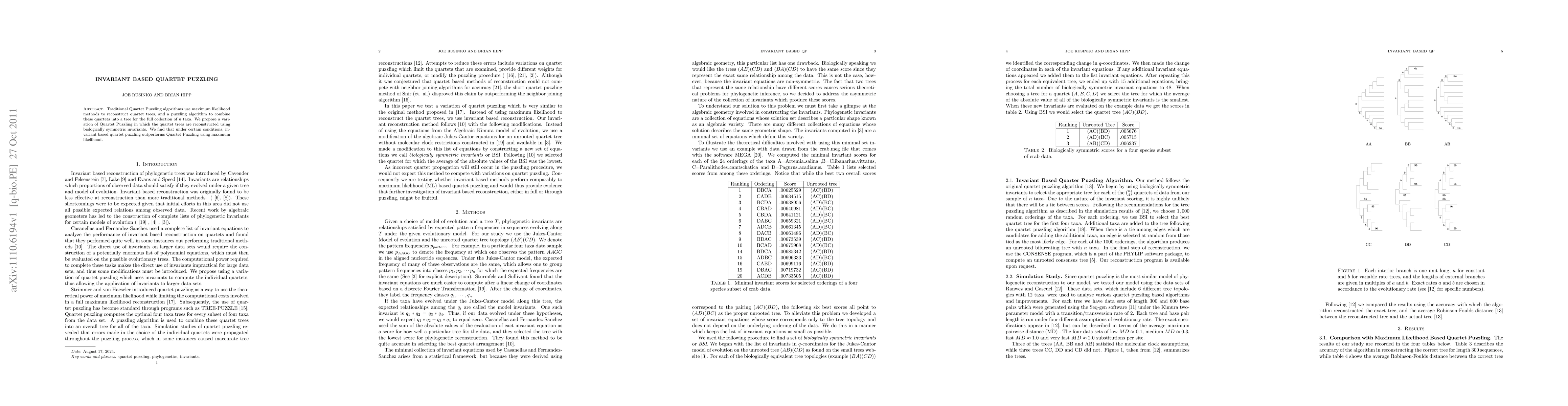 This paper proposes a new version of Quartet Puzzling that reconstructs quartet trees using biologically symmetric invariants instead of maximum likelihood methods. Under specific conditions, the invariant-based approach outperforms traditional Quartet Puzzling.