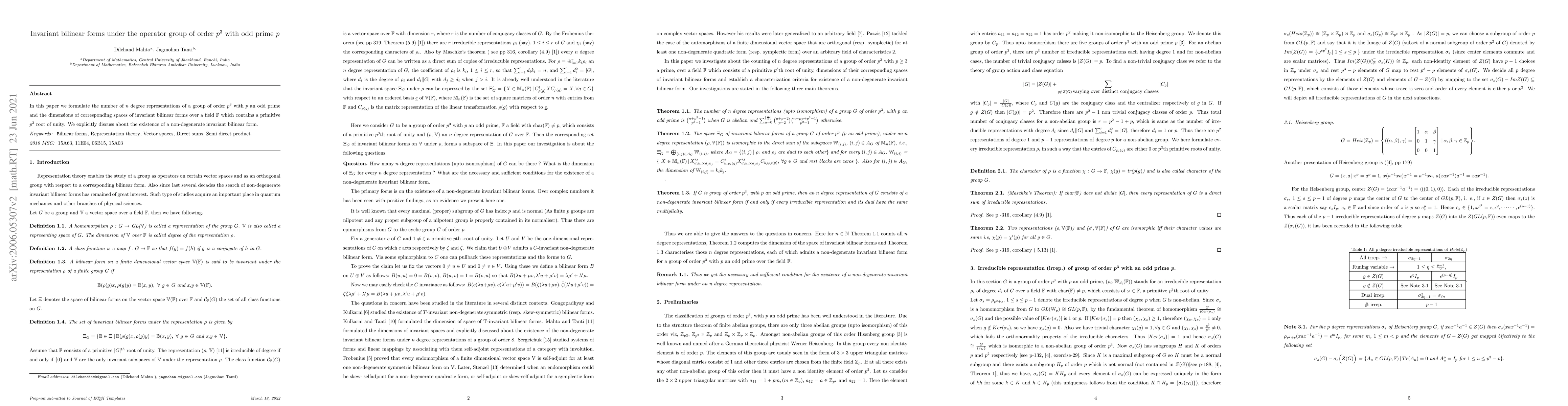 In this paper we compute the number of n degree representations of a group of order p^3 for p an odd prime and the dimensions of corresponding spaces of invariant bilinear forms over an algebraically closed field F. We explicitly discuss about the existence of non-degenerate invariant bilinear forms. The results are important due to their application in the studies of physical sciences.