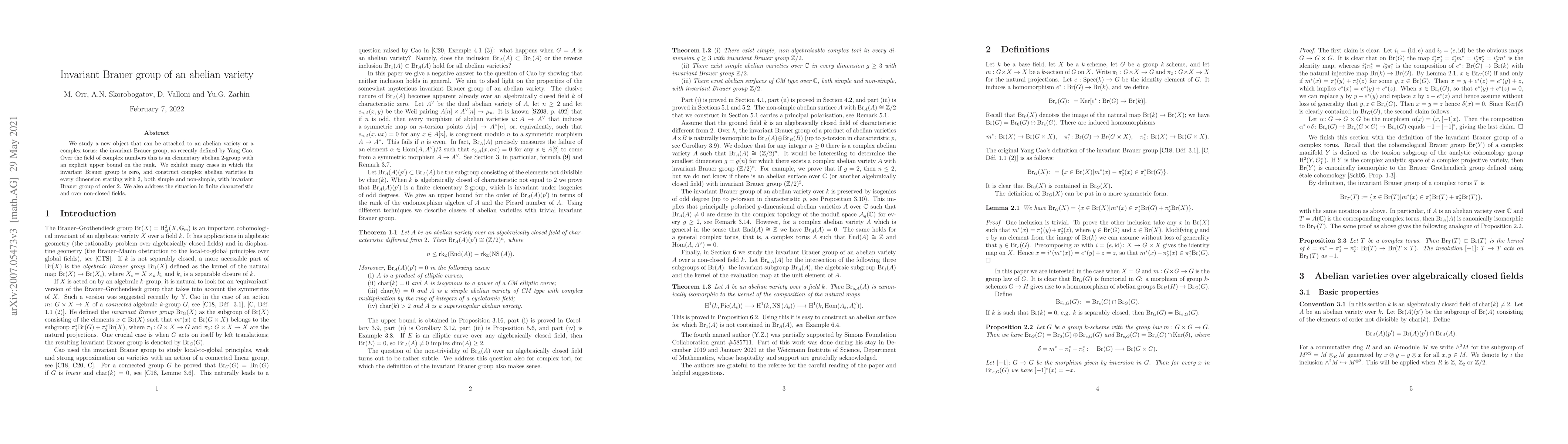 This paper investigates the invariant Brauer group, a newly defined entity associated with abelian varieties or complex tori, showing it to be an elementary abelian 2-group over the complex field with a specified rank upper bound. The authors demonstrate cases where this invariant Brauer group is zero and construct specific examples of complex abelian varieties with non-zero invariant Brauer groups, including those in finite characteristic and over non-closed fields.