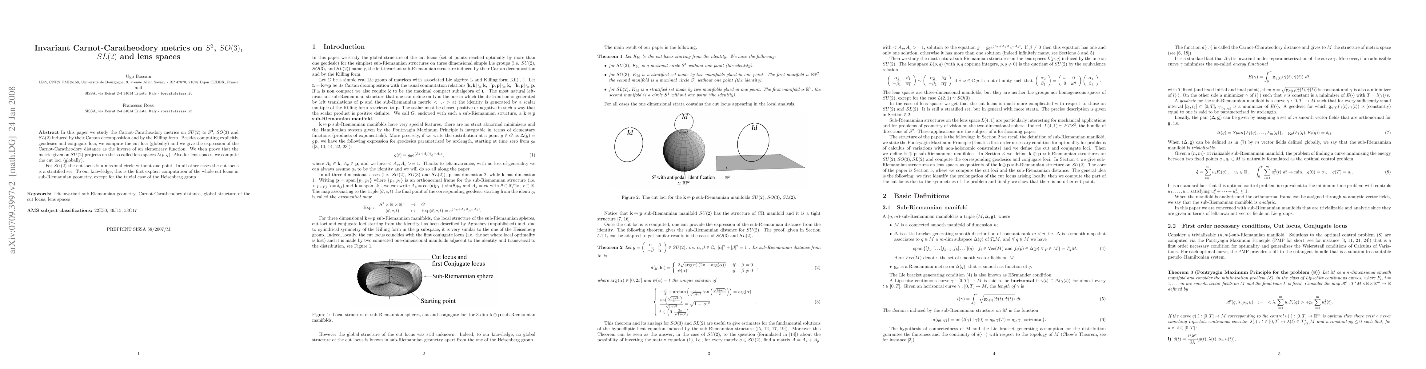 This paper investigates invariant Carnot-Caratheodory metrics on $S^3$, $SO(3)$, $SL(2)$, and lens spaces, deriving explicit geodesics and cut loci. It reveals that the $SU(2)$ metric projects onto lens spaces and provides the first comprehensive global computation of cut loci in sub-Riemannian geometry beyond the Heisenberg group.