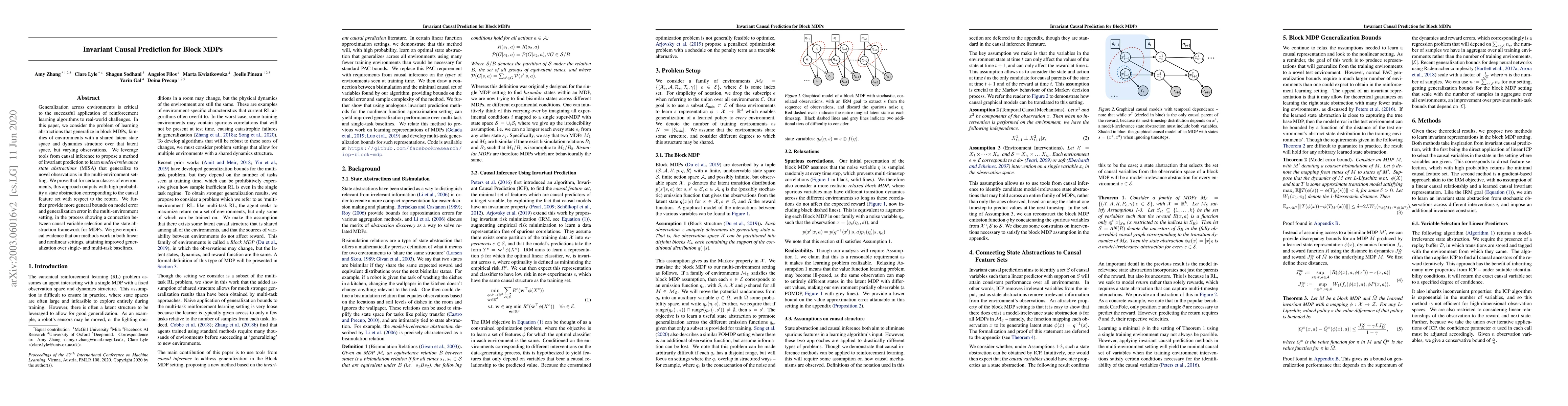 This paper proposes a method for invariant causal prediction in block MDPs to learn model-irrelevant state abstractions that generalize across environments. The approach leverages causal inference to identify causal features, achieving improved generalization over baselines in both linear and nonlinear settings.
