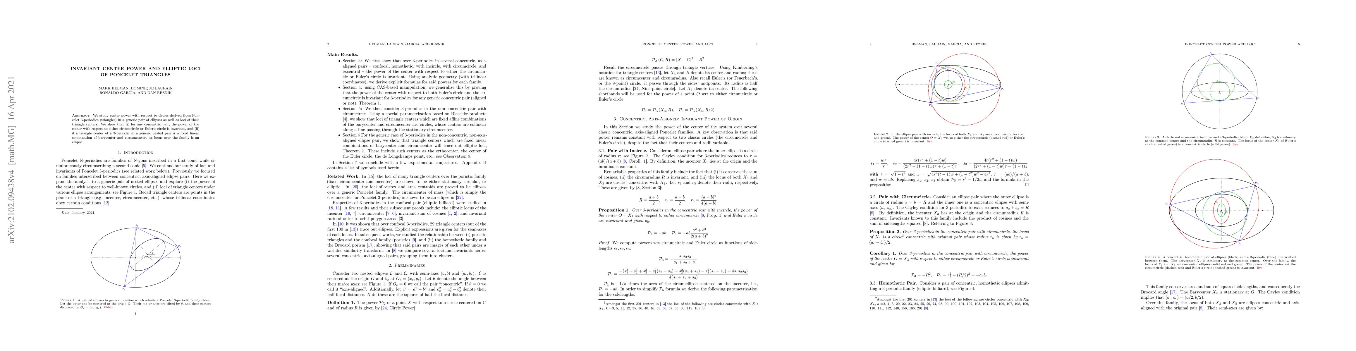 This paper investigates the invariant center power concerning circles derived from Poncelet triangles in a pair of ellipses, demonstrating that the center's power is constant for concentric pairs. It also reveals that the locus of triangle centers in a nested pair forms an elliptical path.
