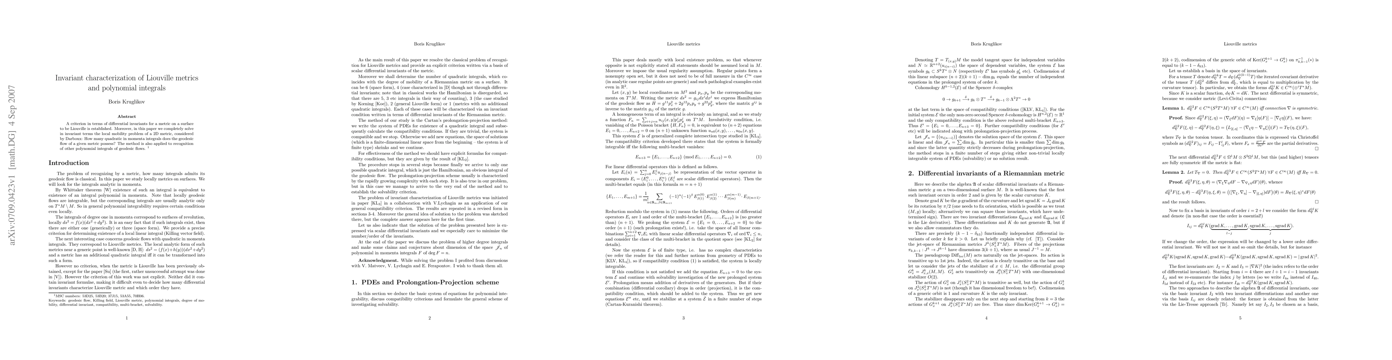 A criterion in terms of differential invariants for a metric on a surface to be Liouville is established. Moreover, in this paper we completely solve in invariant terms the local mobility problem of a 2D metric, considered by Darboux: How many quadratic in momenta integrals does the geodesic flow of a given metric possess? The method is also applied to recognition of other polynomial integrals of geodesic flows.