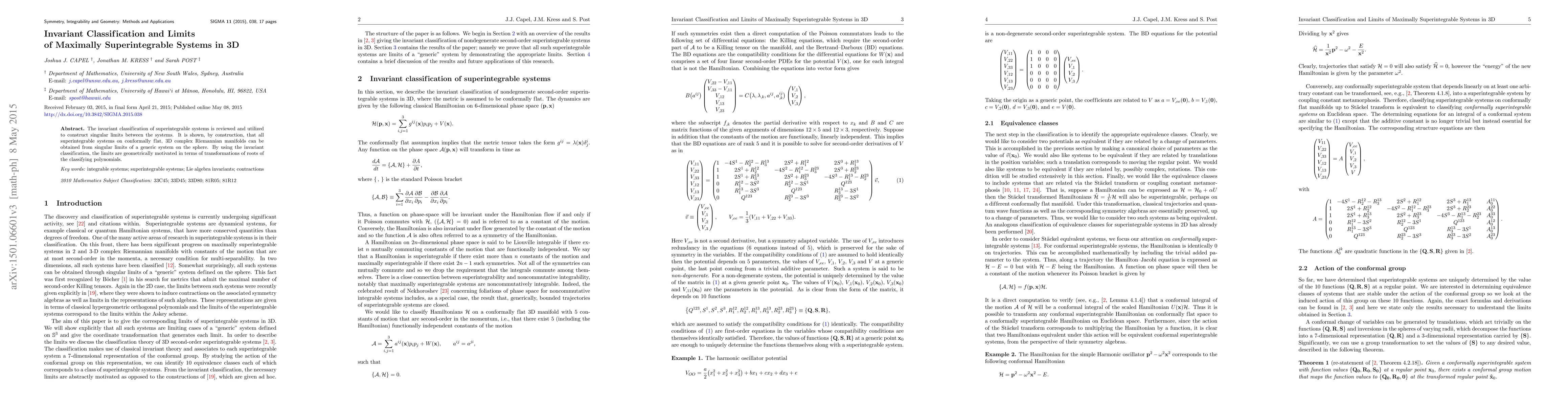 This paper reviews the invariant classification of superintegrable systems and demonstrates how singular limits can connect these systems. It shows that all such systems in 3D conformally flat complex Riemannian manifolds arise from limits of a generic system on the sphere, with the limits geometrically motivated by transformations of the roots of the classifying polynomials.