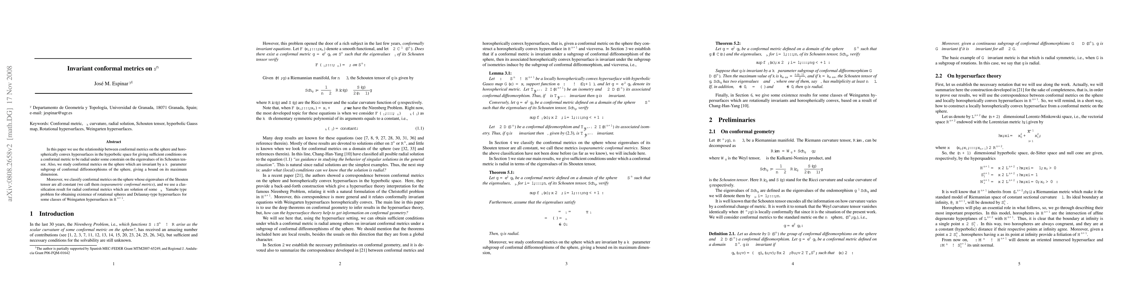 In this paper we use the relationship between conformal metrics on the sphere and horospherically convex hypersurfaces in the hyperbolic space for giving sufficient conditions on a conformal metric to be radial under some constrain on the eigenvalues of its Schouten tensor. Also, we study conformal metrics on the sphere which are invariant by a $k-$parameter subgroup of conformal diffeomorphisms of the sphere, giving a bound on its maximum dimension. Moreover, we classify conformal metrics on the sphere whose eigenvalues of the Shouten tensor are all constant (we call them \emph{isoparametric conformal metrics}), and we use a classification result for radial conformal metrics which are solution of some $\sigma _k -$Yamabe type problem for obtaining existence of rotational spheres and Delaunay-type hypersurfaces for some classes of Weingarten hypersurfaces in $\h ^{n+1}$.