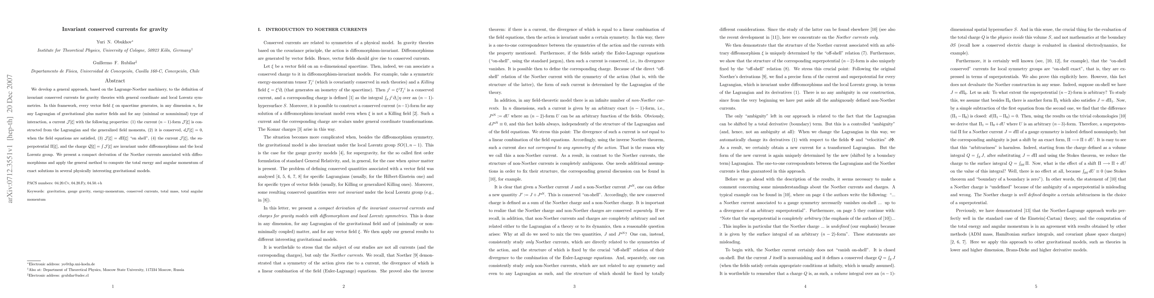 We develop a general approach, based on the Lagrange-Noether machinery, to the definition of invariant conserved currents for gravity theories with general coordinate and local Lorentz symmetries. In this framework, every vector field \xi on spacetime generates, in any dimension n, for any Lagrangian of gravitational plus matter fields and for any (minimal or nonminimal) type of interaction, a current J[\xi] with the following properties: (1) the current (n-1)-form J[\xi] is constructed from the Lagrangian and the generalized field momenta, (2) it is conserved, d J[\xi] = 0, when the field equations are satisfied, (3) J[\xi]= d\Pi[\xi] "on shell", (4) the current J[\xi], the superpotential \Pi[\xi], and the charge Q[\xi] = \int J[\xi] are invariant under diffeomorphisms and the local Lorentz group. We present a compact derivation of the Noether currents associated with diffeomorphisms and apply the general method to compute the total energy and angular momentum of exact solutions in several physically interesting gravitational models.
