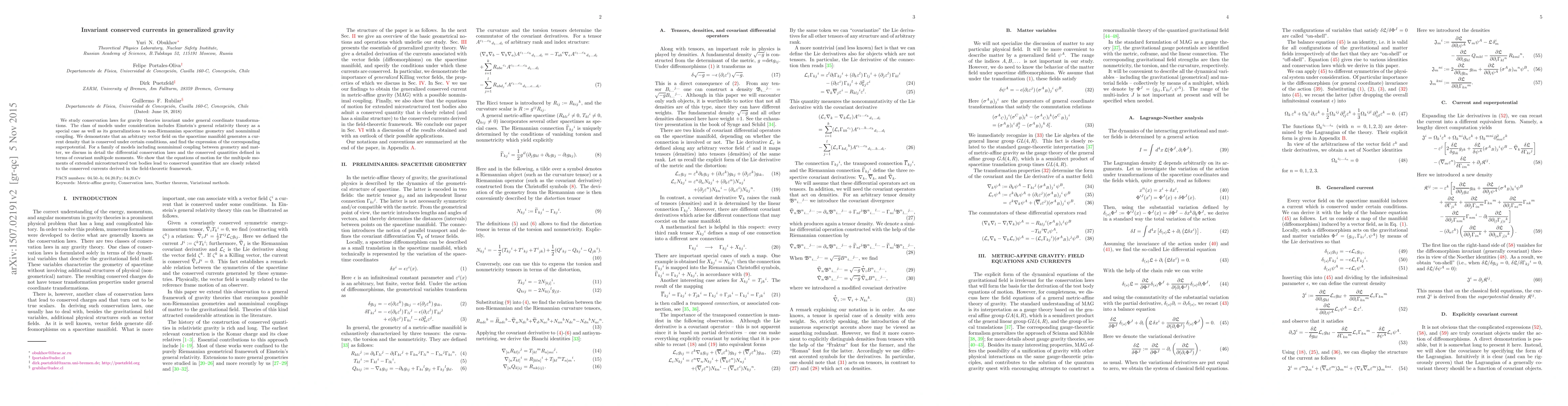 We study conservation laws for gravity theories invariant under general coordinate transformations. The class of models under consideration includes Einstein's general relativity theory as a special case as well as its generalizations to non-Riemannian spacetime geometry and nonminimal coupling. We demonstrate that an arbitrary vector field on the spacetime manifold generates a current density that is conserved under certain conditions, and find the expression of the corresponding superpotential. For a family of models including nonminimal coupling between geometry and matter, we discuss in detail the differential conservation laws and the conserved quantities defined in terms of covariant multipole moments. We show that the equations of motion for the multipole moments of extended microstructured test bodies lead to conserved quantities that are closely related to the conserved currents derived in the field-theoretic framework.