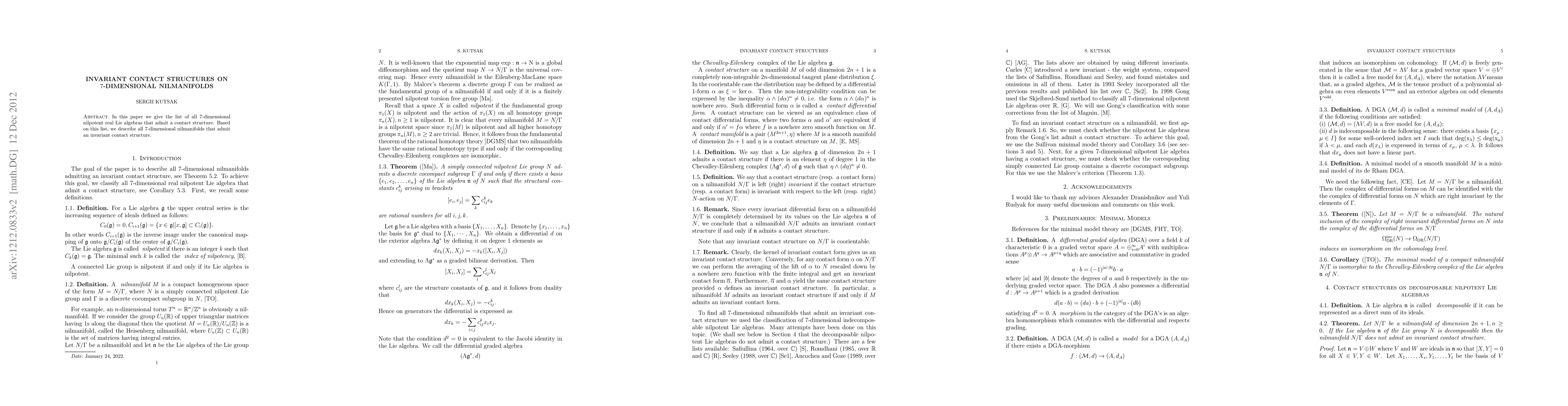 In this paper we give the list of all 7-dimensional nilpotent real Lie algebras that admit a contact structure. Based on this list, we describe all 7-dimensional nilmanifolds that admit an invariant contact structure.