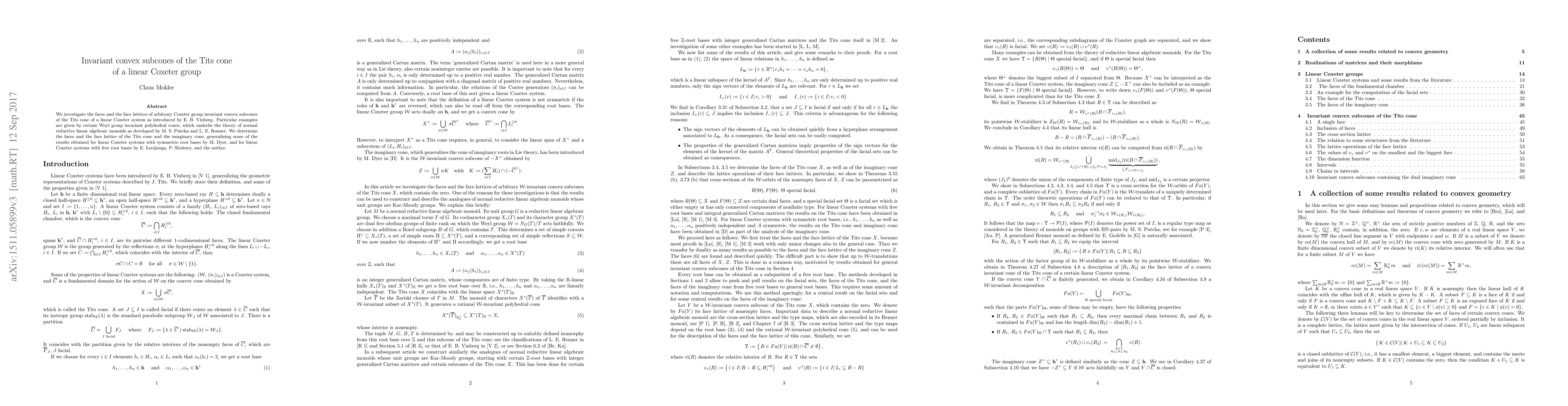 We investigate the faces and the face lattices of arbitrary Coxeter group invariant convex subcones of the Tits cone of a linear Coxeter system as introduced by E. B. Vinberg. Particular examples are given by certain Weyl group invariant convex cones which underlie the theory of normal reductive linear algebraic monoids as developed by M. S. Putcha and L. E. Renner. We determine the faces and the face lattice of the Tits cone and the imaginary cone, generalizing some of the results obtained for linear Coxeter systems with symmetric root bases by M. Dyer, and for linear Coxeter systems with free root bases by E. Looijenga, P. Slodowy, and the author.