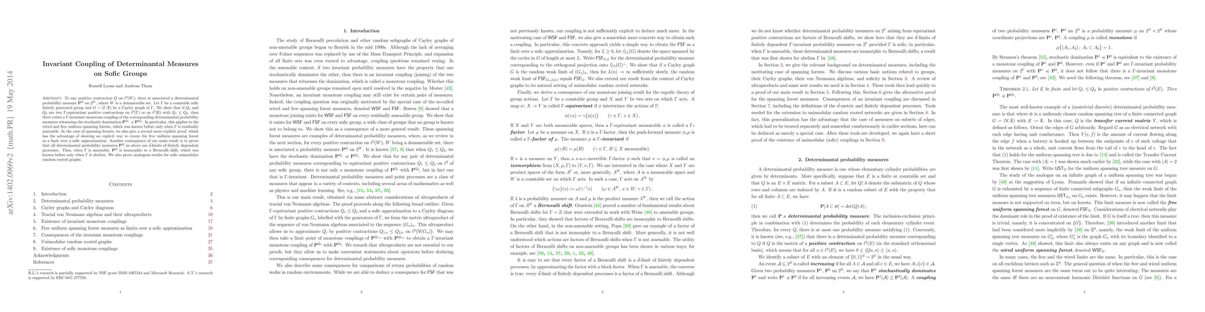 To any positive contraction $Q$ on $\ell^2(W)$, there is associated a determinantal probability measure ${\mathbf P}^Q$ on $2^W$, where $W$ is a denumerable set. Let $\Gamma$ be a countable sofic finitely generated group and $G = (\Gamma, \mathsf{E})$ be a Cayley graph of $\Gamma$. We show that if $Q_1$ and $Q_2$ are two $\Gamma$-equivariant positive contractions on $\ell^2(\Gamma)$ or on $\ell^2(\mathsf{E})$ with $Q_1 \le Q_2$, then there exists a $\Gamma$-invariant monotone coupling of the corresponding determinantal probability measures witnessing the stochastic domination ${\bf P}^{Q_1} \preccurlyeq {\bf P}^{Q_2}$. In particular, this applies to the wired and free uniform spanning forests, which was known before only when $\Gamma$ is residually amenable. In the case of spanning forests, we also give a second more explicit proof, which has the advantage of showing an explicit way to create the free uniform spanning forest as a limit over a sofic approximation. Another consequence of our main result is to prove that all determinantal probability measures ${\bf P}^Q$ as above are ${\bar d}$-limits of finitely dependent processes. Thus, when $\Gamma$ is amenable, ${\bf P}^Q$ is isomorphic to a Bernoulli shift, which was known before only when $\Gamma$ is abelian. We also prove analogous results for sofic unimodular random rooted graphs.