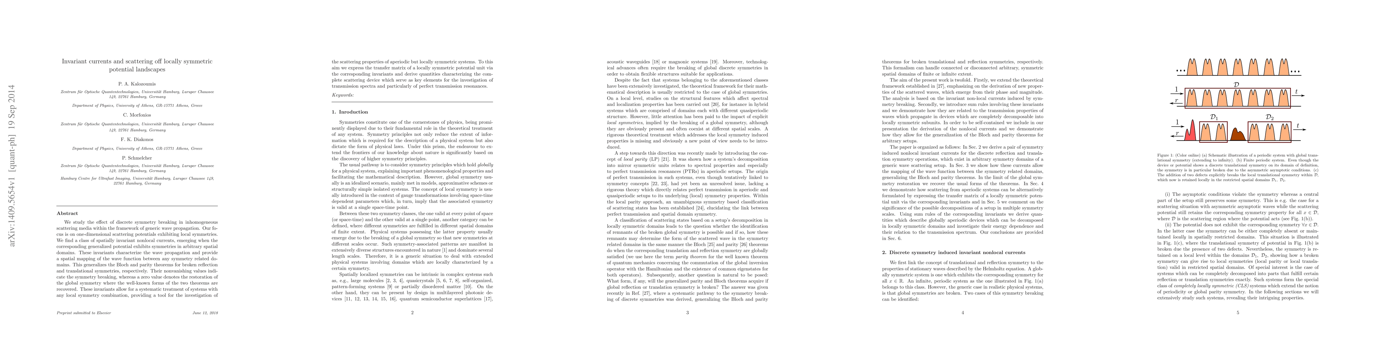 This paper investigates the impact of symmetry breaking in scattering media through the lens of invariant nonlocal currents in one-dimensional potential landscapes with local symmetries. The study reveals a class of invariant currents that generalize the Bloch and parity theorems, offering insights into the scattering properties of locally symmetric systems.