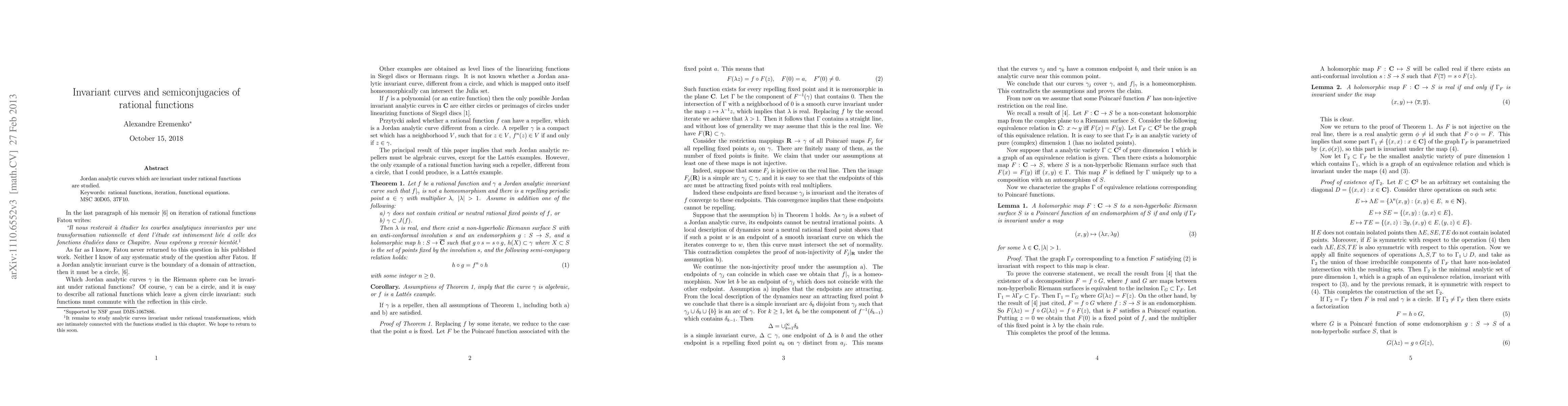 Summary: This paper investigates Jordan analytic curves that remain unchanged under the action of rational functions, exploring their properties and the semiconjugacies that arise in their study. The focus is on understanding the invariant structures and their implications for rational dynamics.