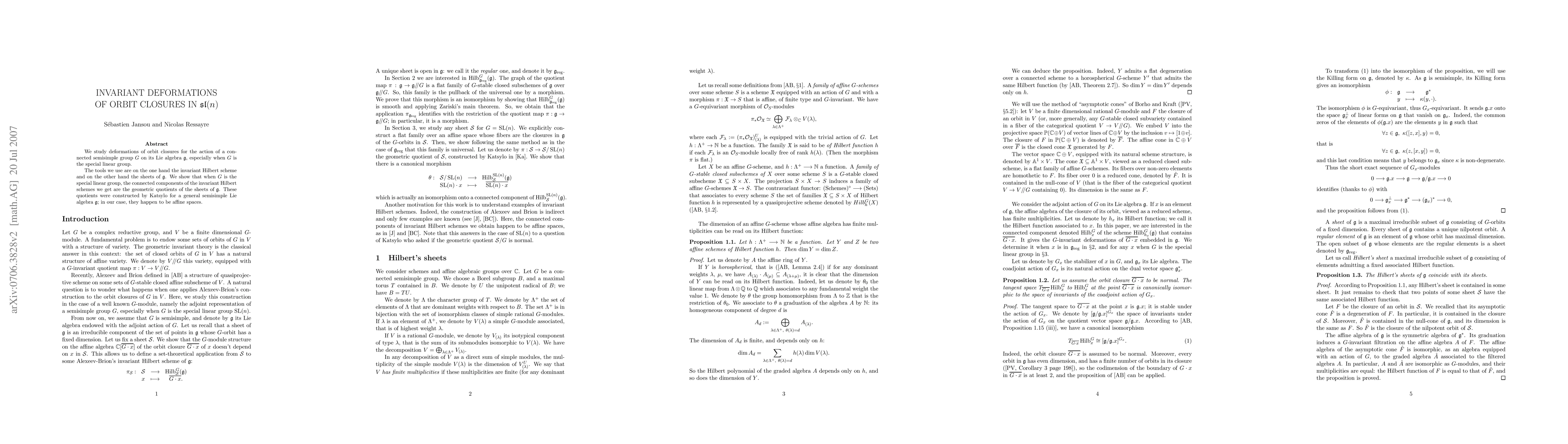 We study deformations of orbit closures for the action of a connected semisimple group $G$ on its Lie algebra $\mathfrak{g}$, especially when $G$ is the special linear group. The tools we use are on the one hand the invariant Hilbert scheme and on the other hand the sheets of $\mathfrak{g}$. We show that when $G$ is the special linear group, the connected components of the invariant Hilbert schemes we get are the geometric quotients of the sheets of $\mathfrak{g}$. These quotients were constructed by Katsylo for a general semisimple Lie algebra $\mathfrak{g}$; in our case, they happen to be affine spaces.
