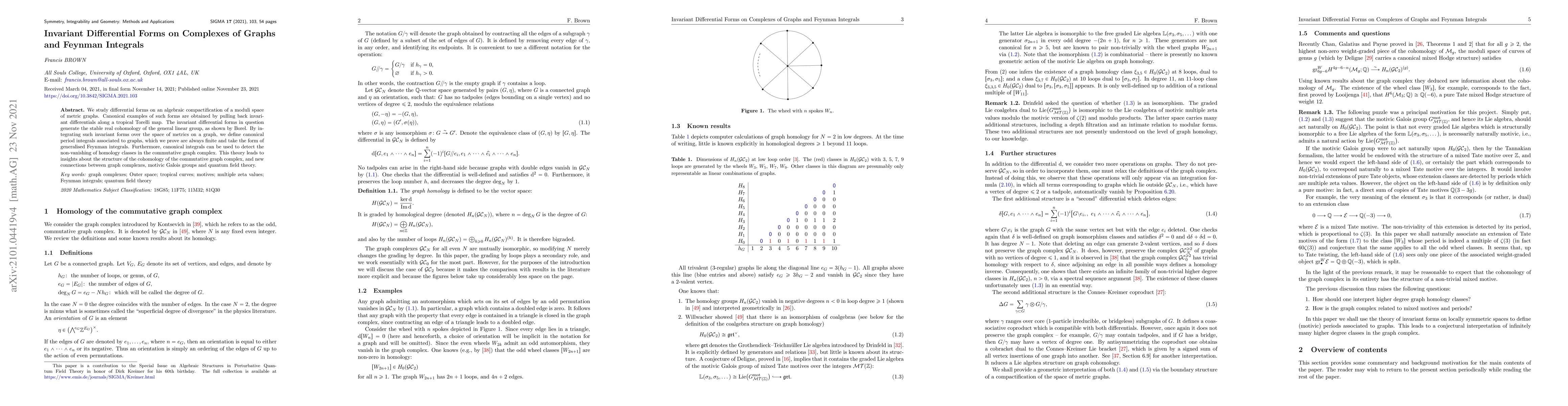 We study differential forms on an algebraic compactification of a moduli space of metric graphs. Canonical examples of such forms are obtained by pulling back invariant differentials along a tropical Torelli map. The invariant differential forms in question generate the stable real cohomology of the general linear group, as shown by Borel. By integrating such invariant forms over the space of metrics on a graph, we define canonical period integrals associated to graphs, which we prove are always finite and take the form of generalised Feynman integrals. Furthermore, canonical integrals can be used to detect the non-vanishing of homology classes in the commutative graph complex. This theory leads to insights about the structure of the cohomology of the commutative graph complex, and new connections between graph complexes, motivic Galois groups and quantum field theory.