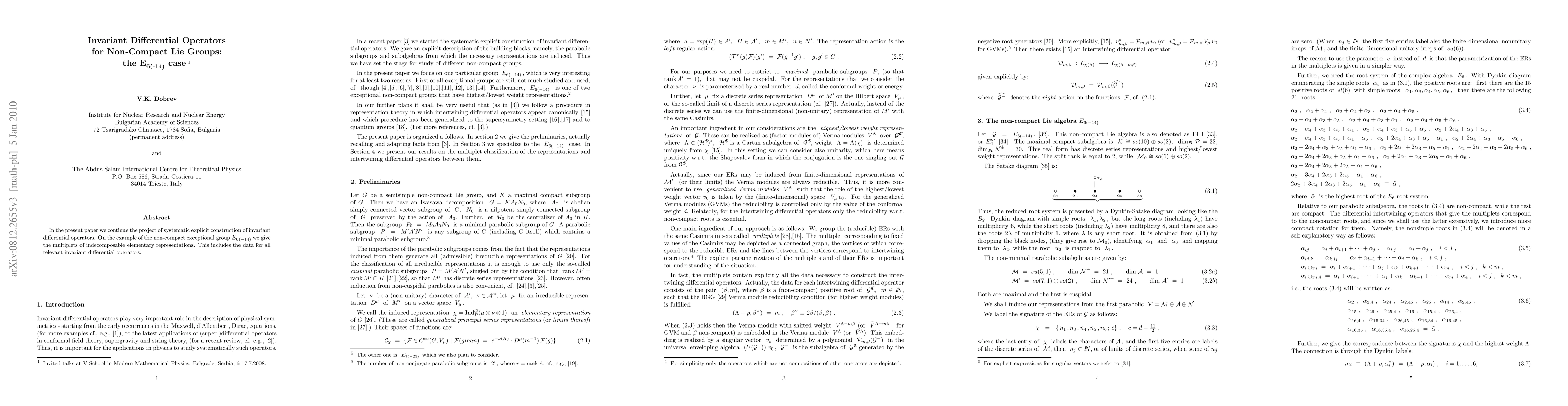 In the present paper we continue the project of systematic explicit construction of invariant differential operators. On the example of the non-compact exceptional group $E_{6(-14)}$ we give the multiplets of indecomposable elementary representations. This includes the data for all relevant invariant differential operators.