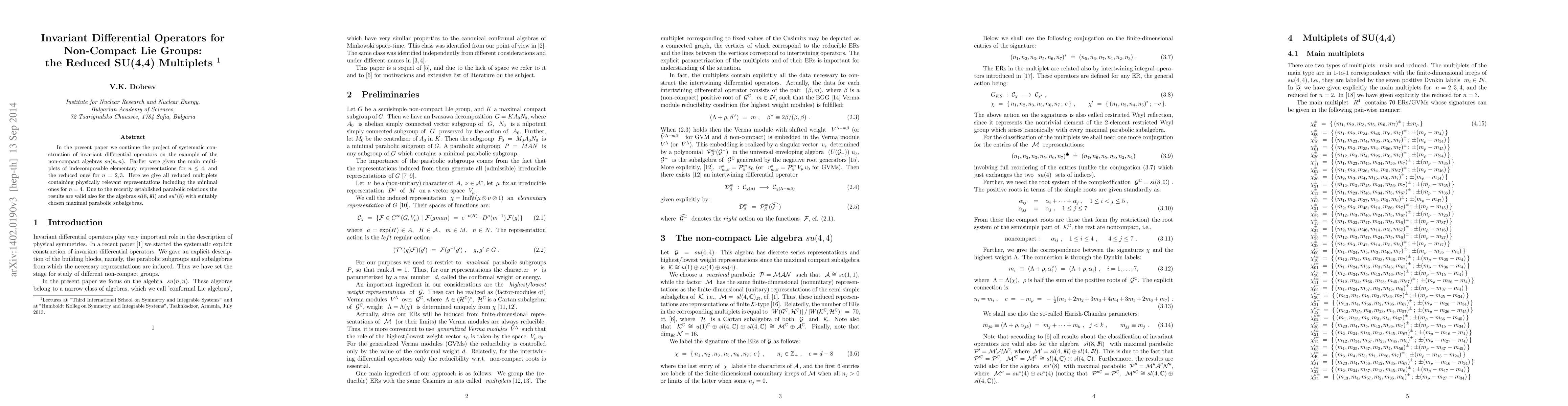 This paper constructs invariant differential operators for the non-compact algebra $su(4,4)$, detailing all reduced multiplets, including minimal ones. The results extend to $sl(8,\mathbb{R})$ and $su^*(8)$ via established parabolic relations.