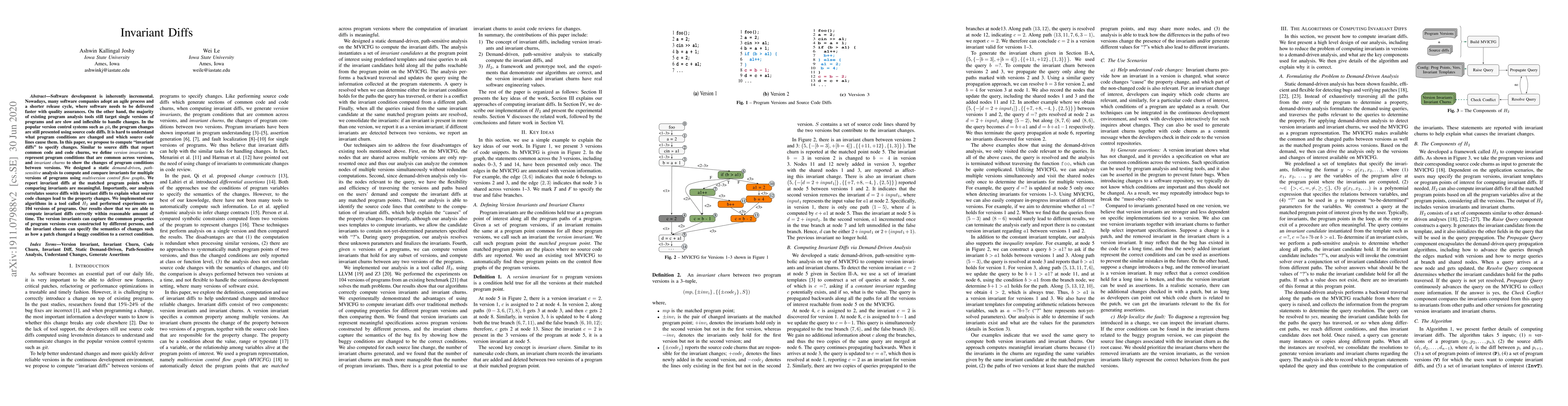 This paper proposes "invariant diffs" to analyze incremental changes in software across multiple versions, using a static analysis tool called $H_2$. It identifies version invariants and invariant churns to represent common program conditions and changes, correlating these with source code diffs to explain how source changes impact program properties.