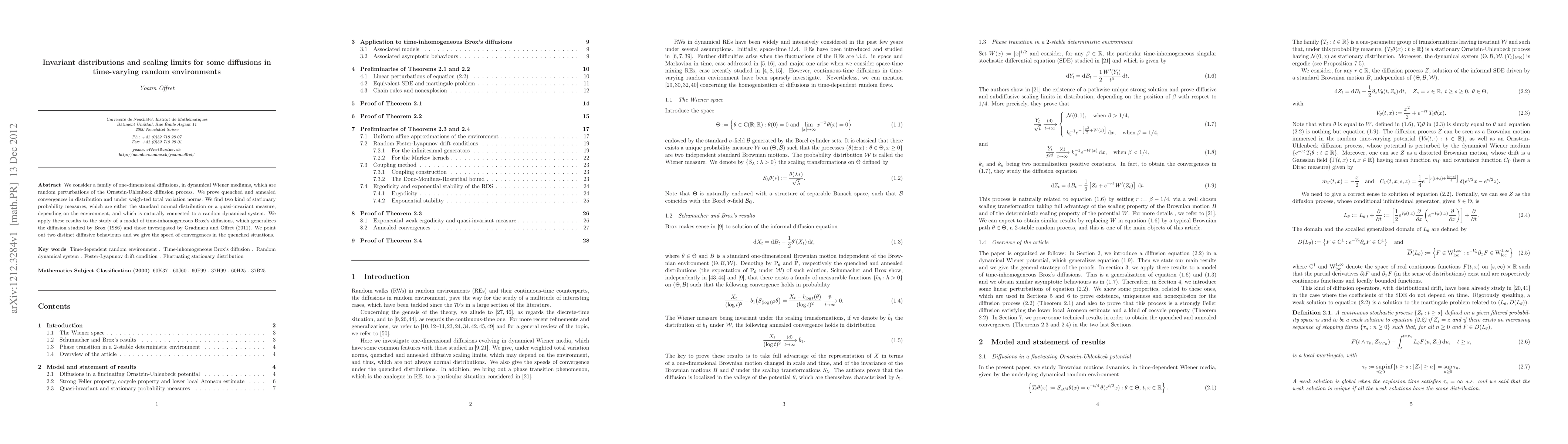 This paper investigates one-dimensional diffusions in random time-varying environments, proving convergence in distribution for perturbed Ornstein-Uhlenbeck processes. It identifies two types of stationary measures: the standard normal distribution and a quasi-invariant measure linked to a random dynamical system, and applies these findings to time-inhomogeneous Brox's diffusions.