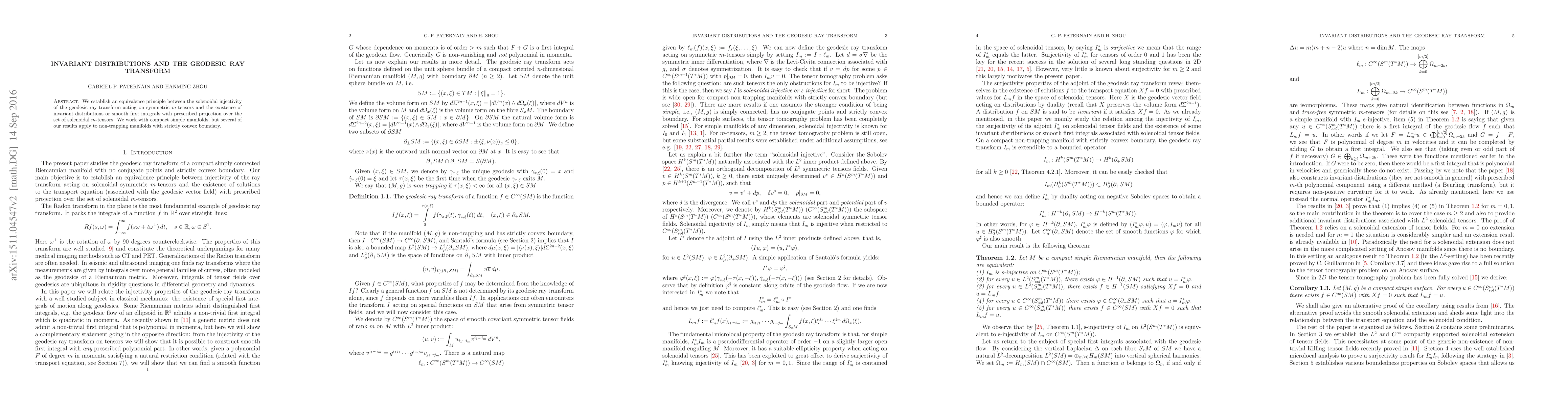 We establish an equivalence principle between the solenoidal injectivity of the geodesic ray transform acting on symmetric $m$-tensors and the existence of invariant distributions or smooth first integrals with prescribed projection over the set of solenoidal $m$-tensors. We work with compact simple manifolds, but several of our results apply to non-trapping manifolds with strictly convex boundary.